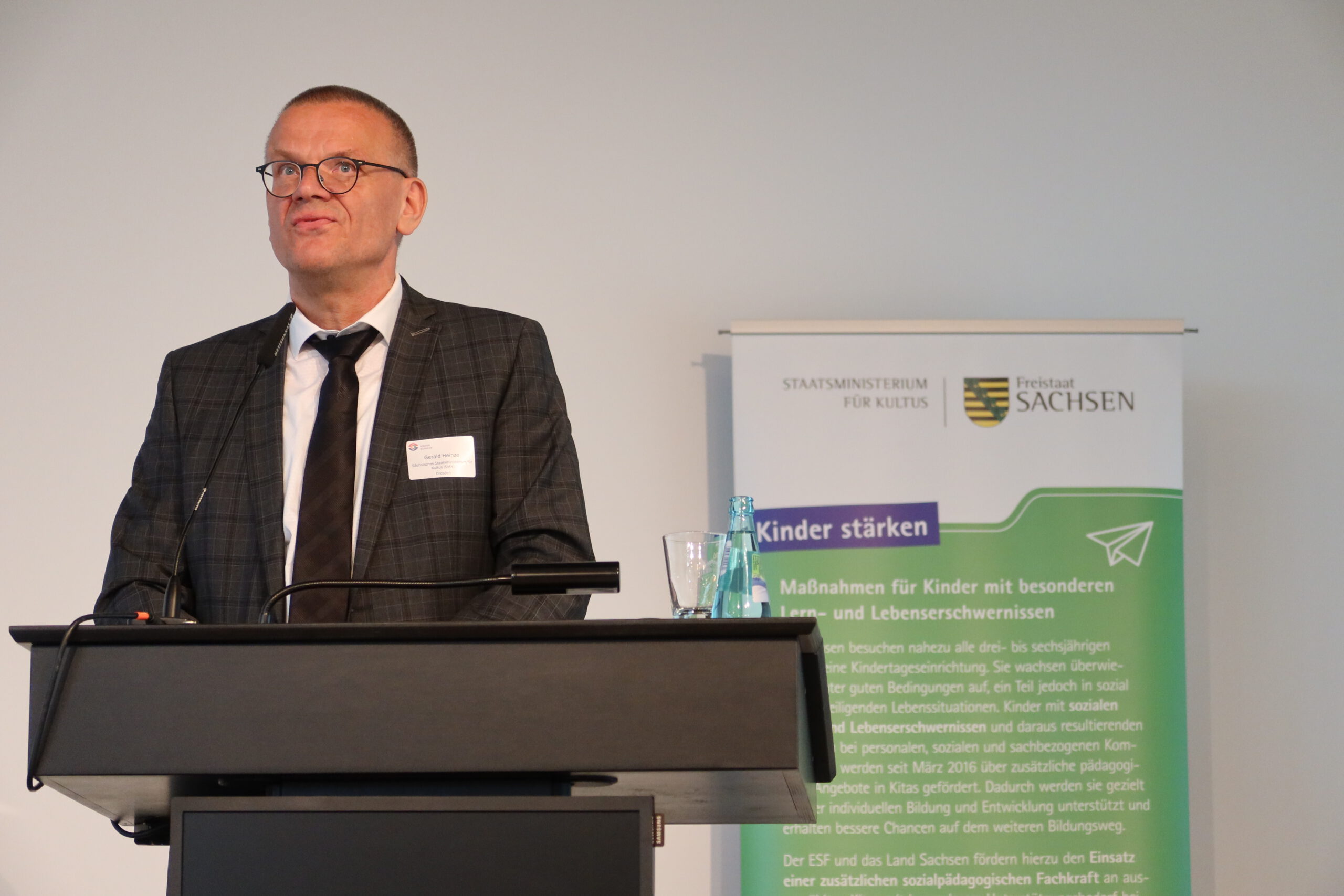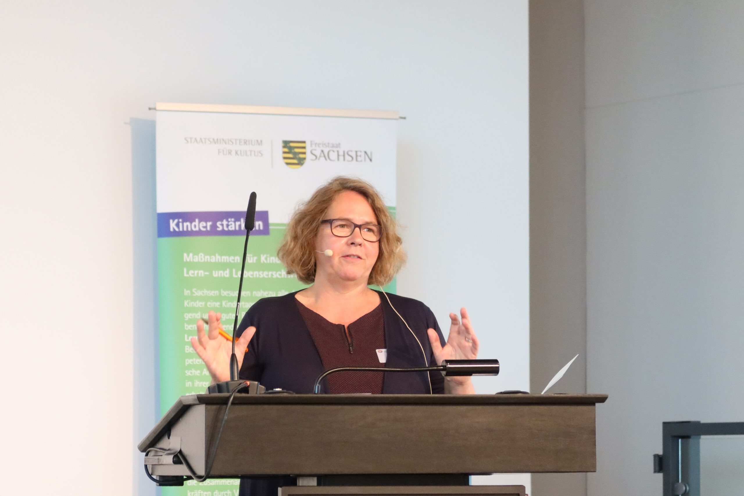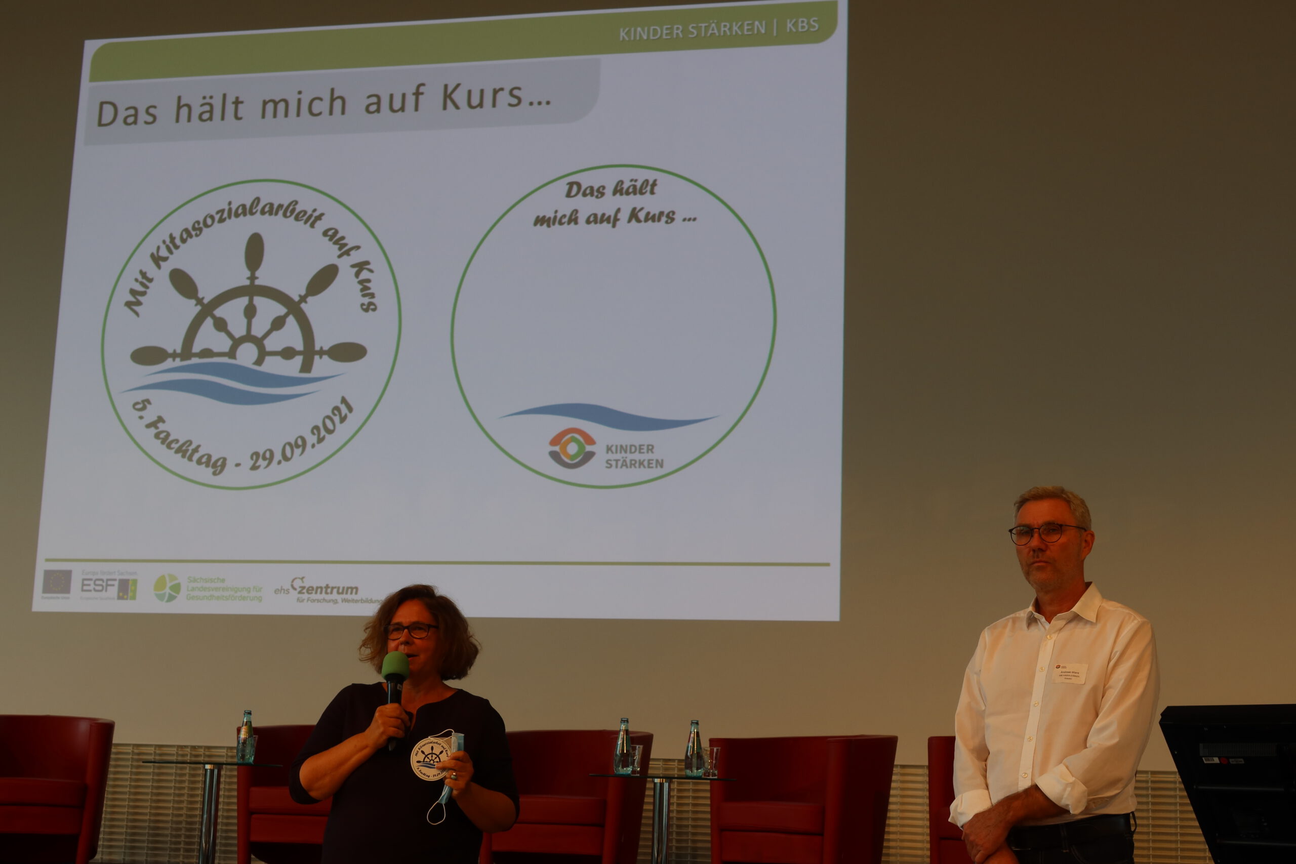 Silke Meyer und Andreas Wiere, Projektleitung der Kompetenz- und Beratungsstelle (KBS), moderierten den Fachtag und eröffneten die Bühne für die Grußworte von Hanka Jarisch, Berufsgenossenschaft für Gesundheitsdienst und Wohlfahrtspflege (BGW) und von Gerald Heinze, Abteilungsleiter Allgemeinbildende Schulen/Kindertagesbetreuung beim Sächsischen Staatsministerium für Kultus (SMK). Gerald Heize würdigte die bedeutsame Arbeit und die Erfolge der Akteure im Programm KINDER STÄRKEN, denn diese leisten einen sichtbaren und wertvollen Beitrag zur Verbesserung der Chancengerechtigkeit der Kinder und unterstützen Familien bei der Wahrnehmung ihres Erziehungsauftrages. Durch Kitasozialarbeit erhält die Kita als Bildungs- und Lebensort eine entscheidende fachliche Ergänzung. Dies wird wahrgenommen und soll – so sicher eine entscheidende und für alle erfreuliche Botschaft – auch in den Jahren 2022 bis 2027 fortgeführt und ausgebaut werden.