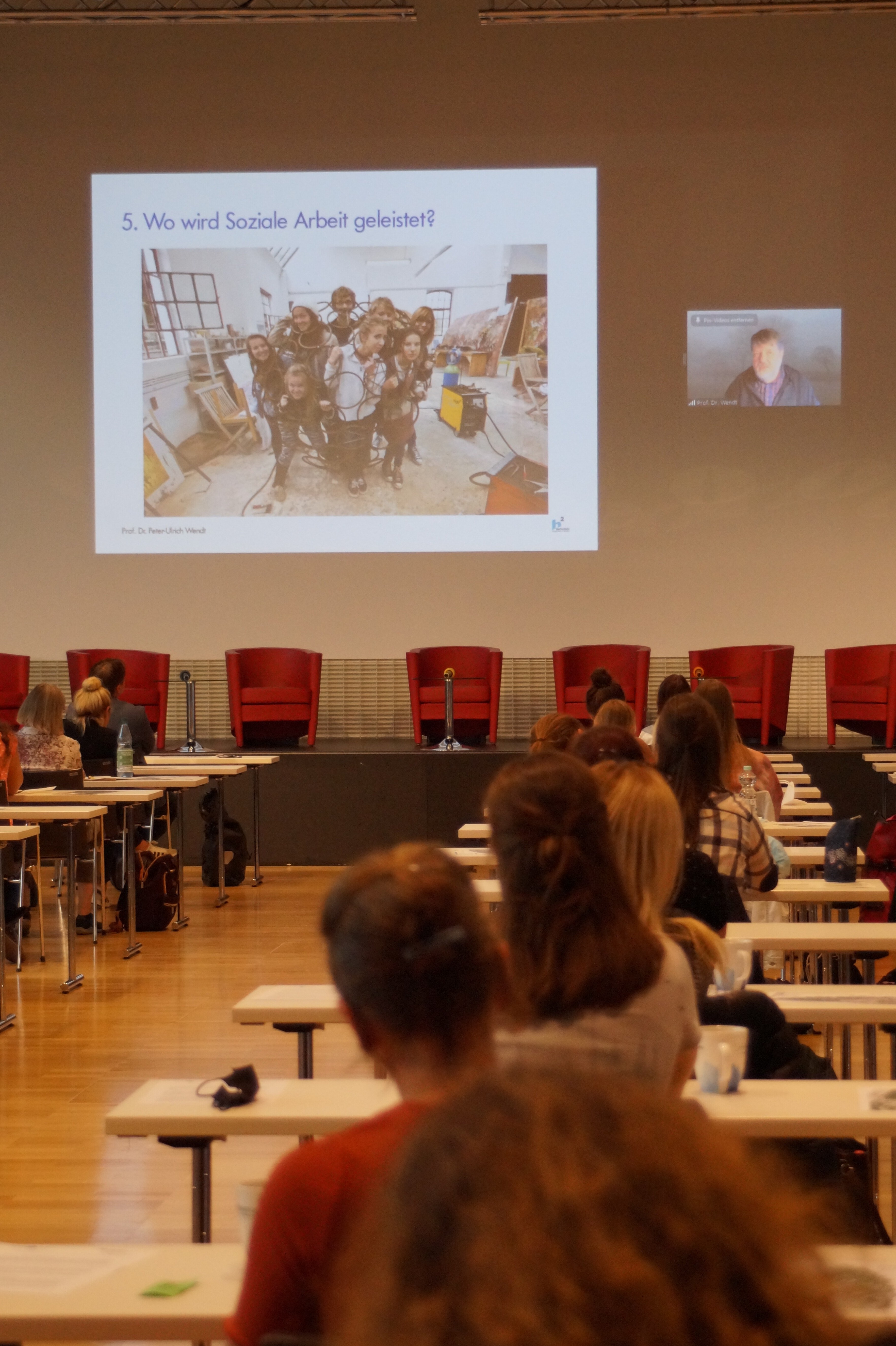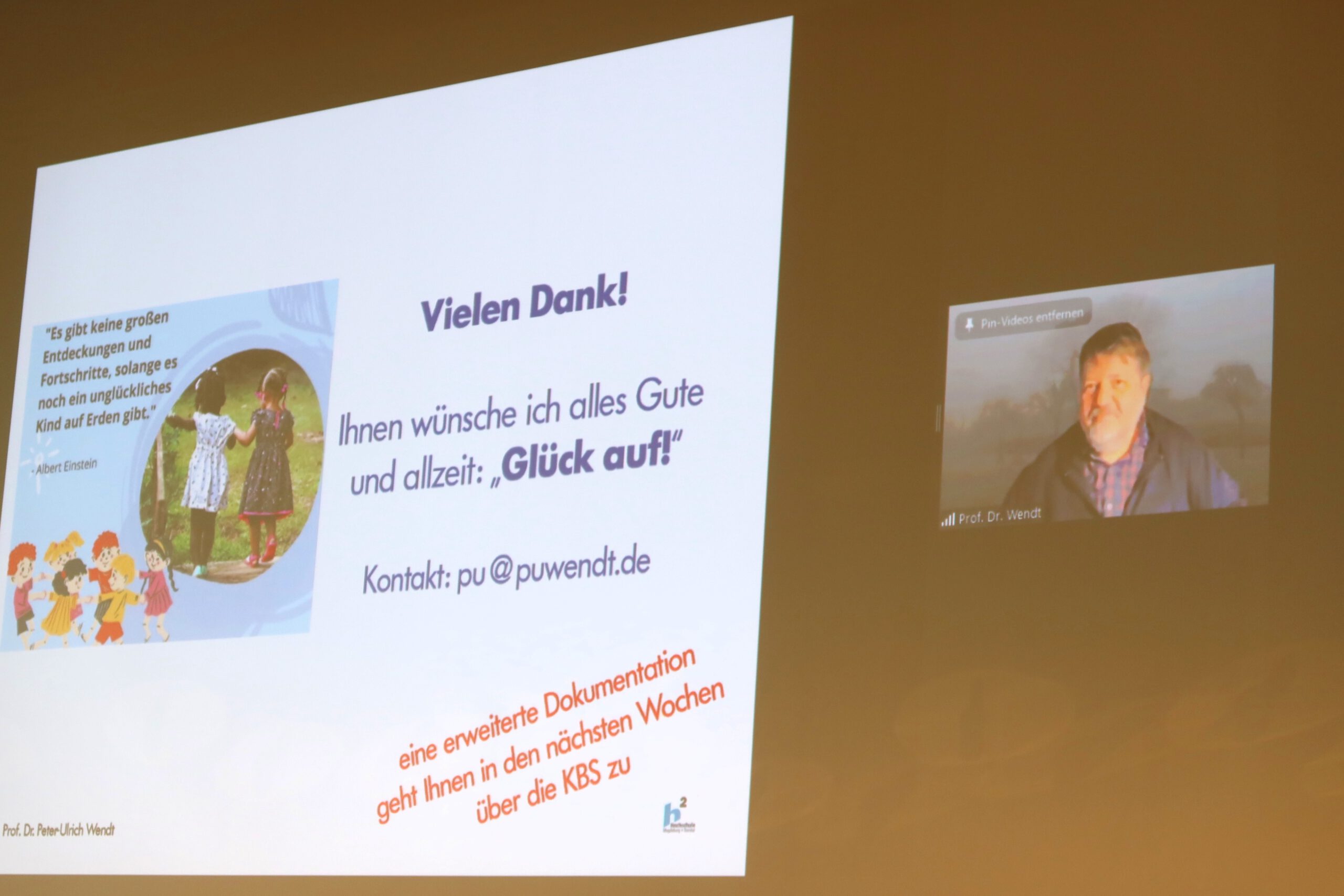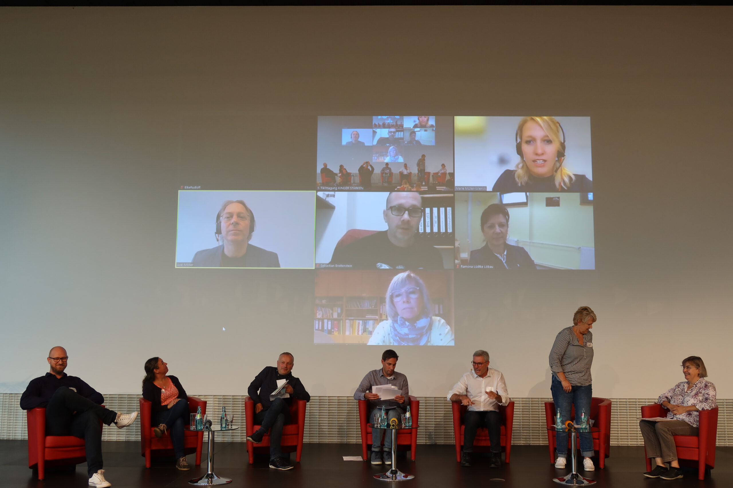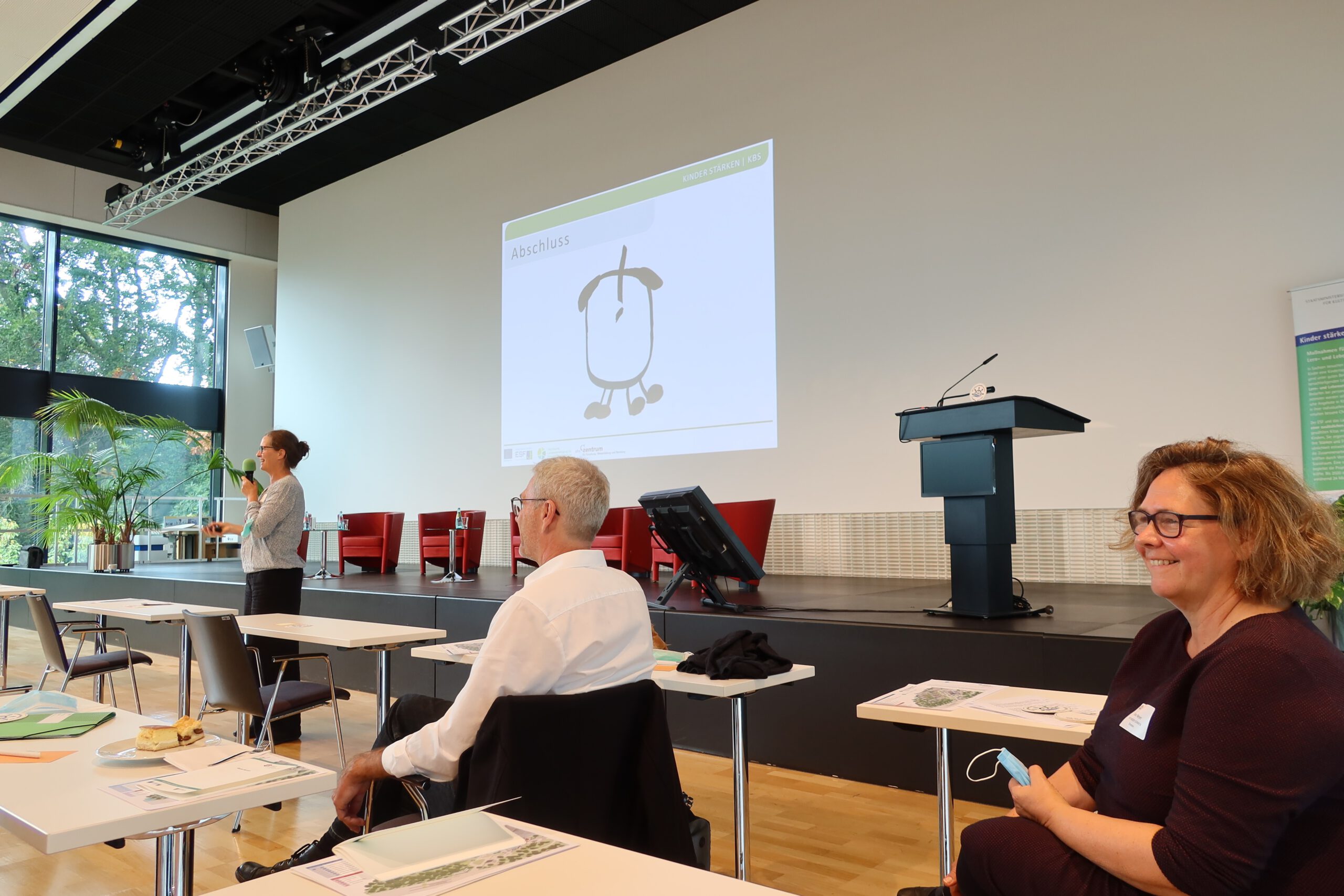 Den Vormittag komplementierte Silke Meyer mit einem Ausblick und Fazit zum Programm KINDER STÄRKEN. Ihre Kernbotschaft lautete: „Bewährtes erhalten und erweitern.“ Danach wurden die Online-Teilnehmenden verabschiedet und bekamen mit ihren Zoom-Kacheln nochmal einen Platz an der Leinwand im Großen Saal.