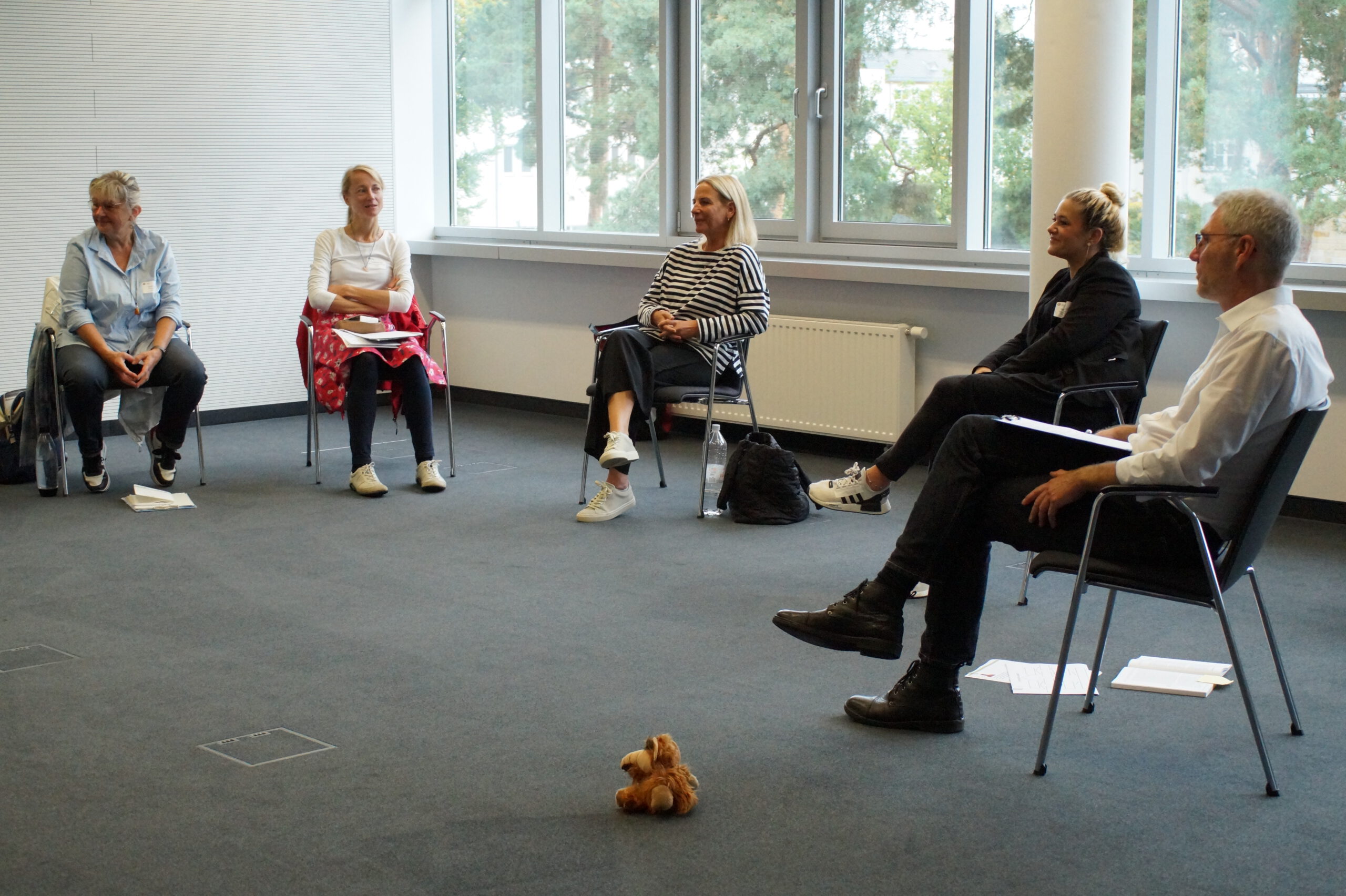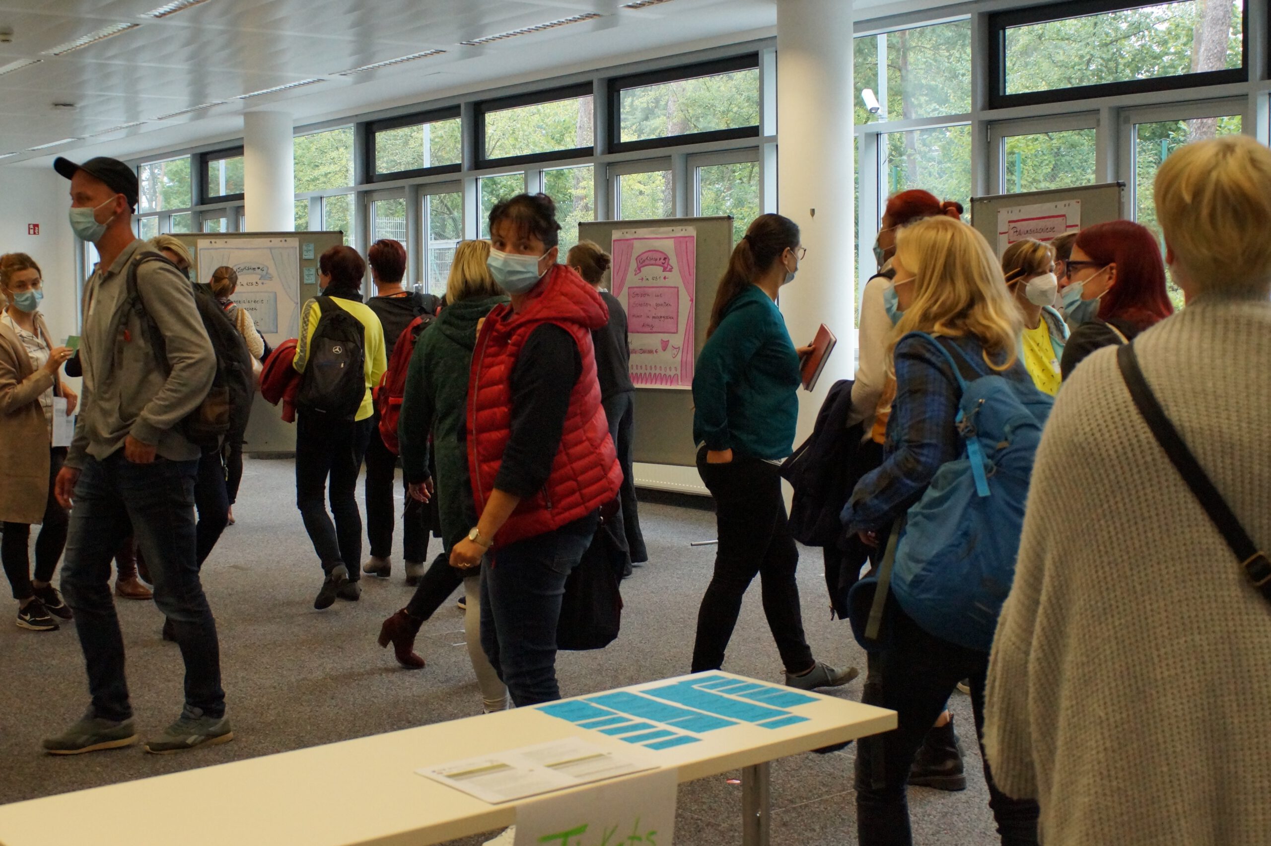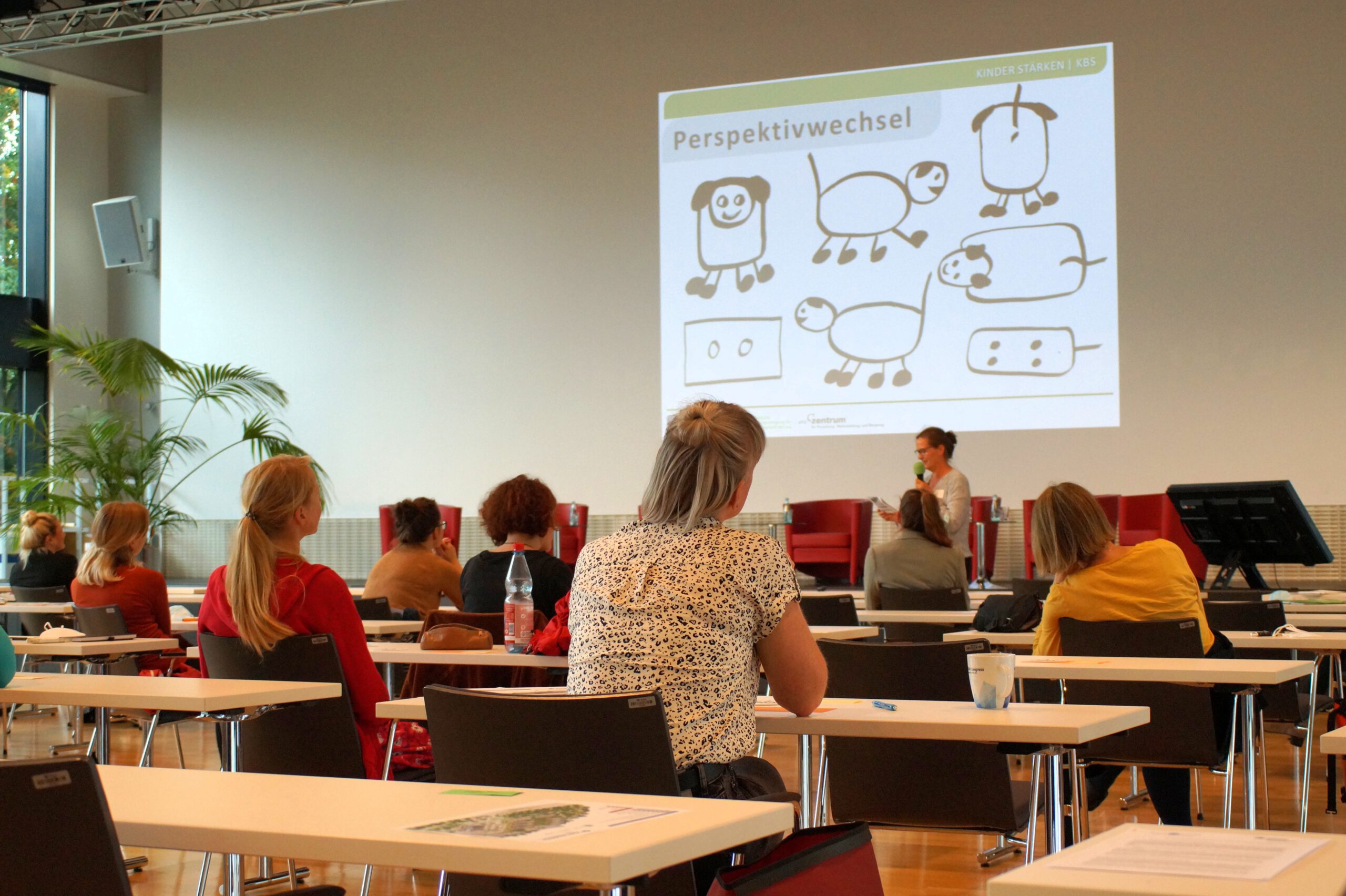 Im Abschlussplenum wurden die Teilnehmenden zu einer Aktivierungsübung eingeladen. Diese regte sie zu einem Perspektivwechsel im übertragenen Sinn an: Kitasozialarbeit braucht zum einen immer wieder die Blickerweiterung und zum anderen die Reflexion der persönlichen Motivation.