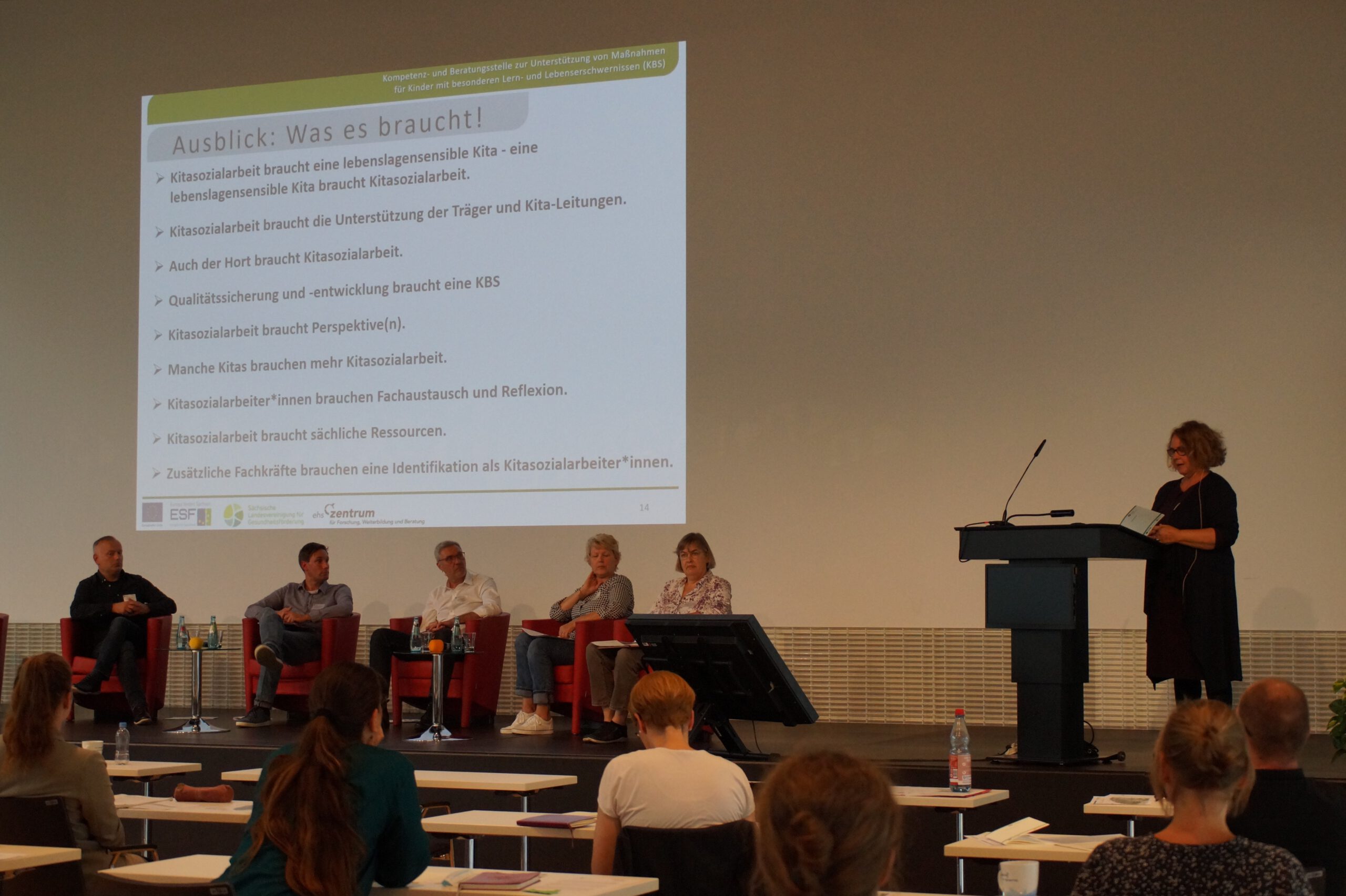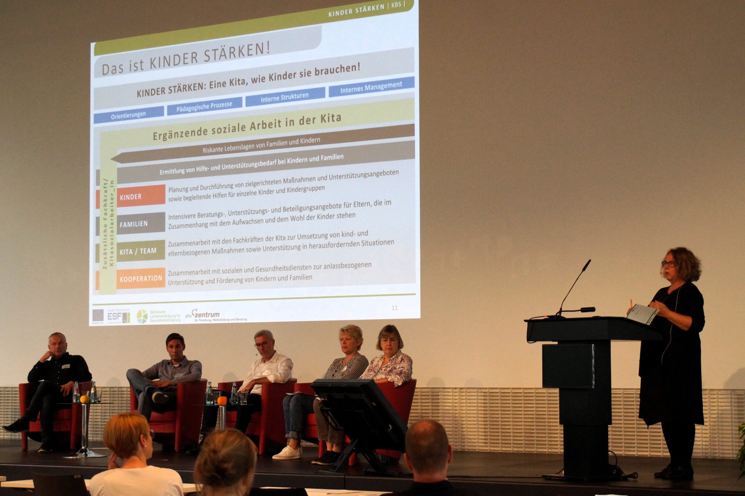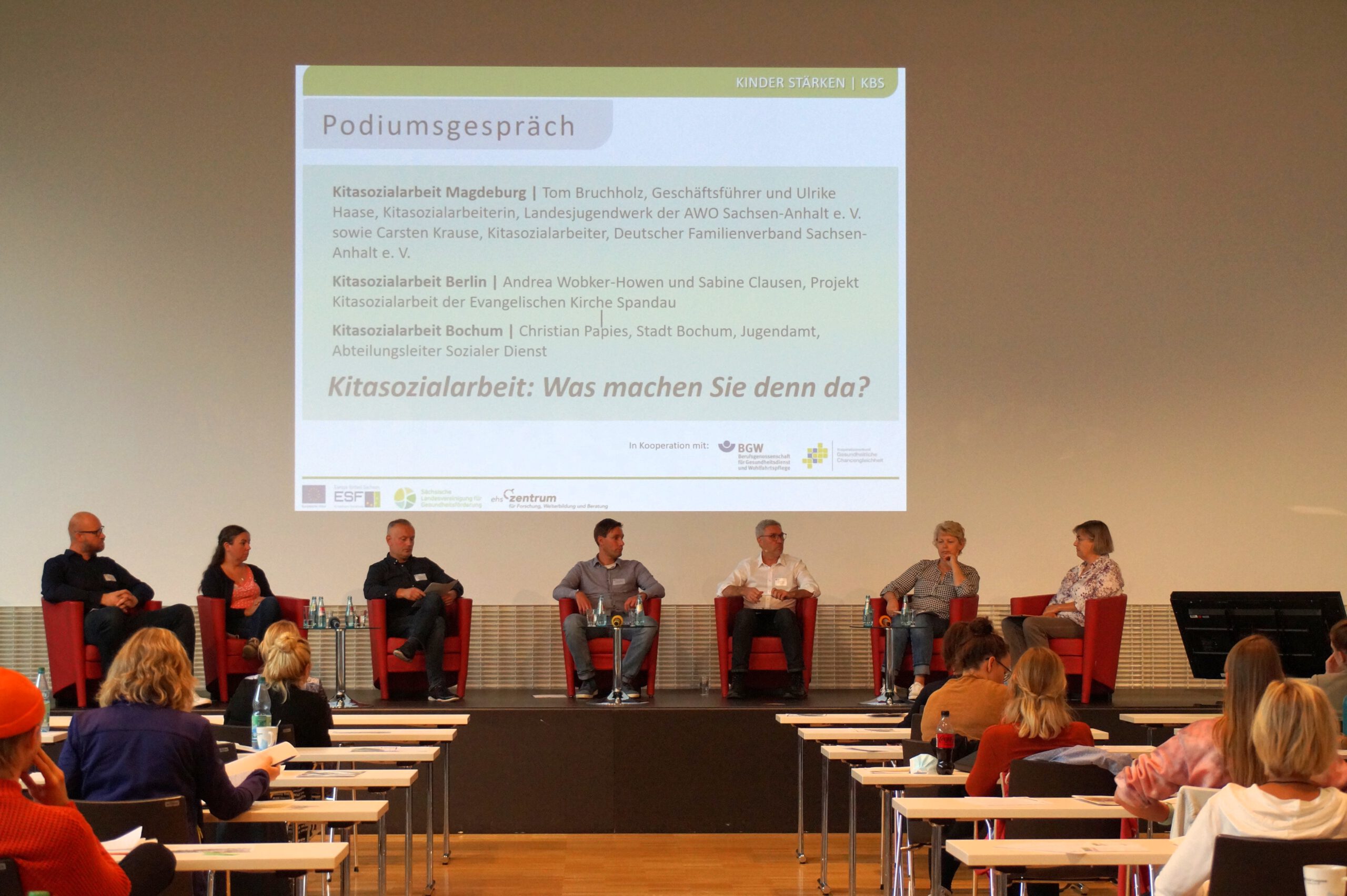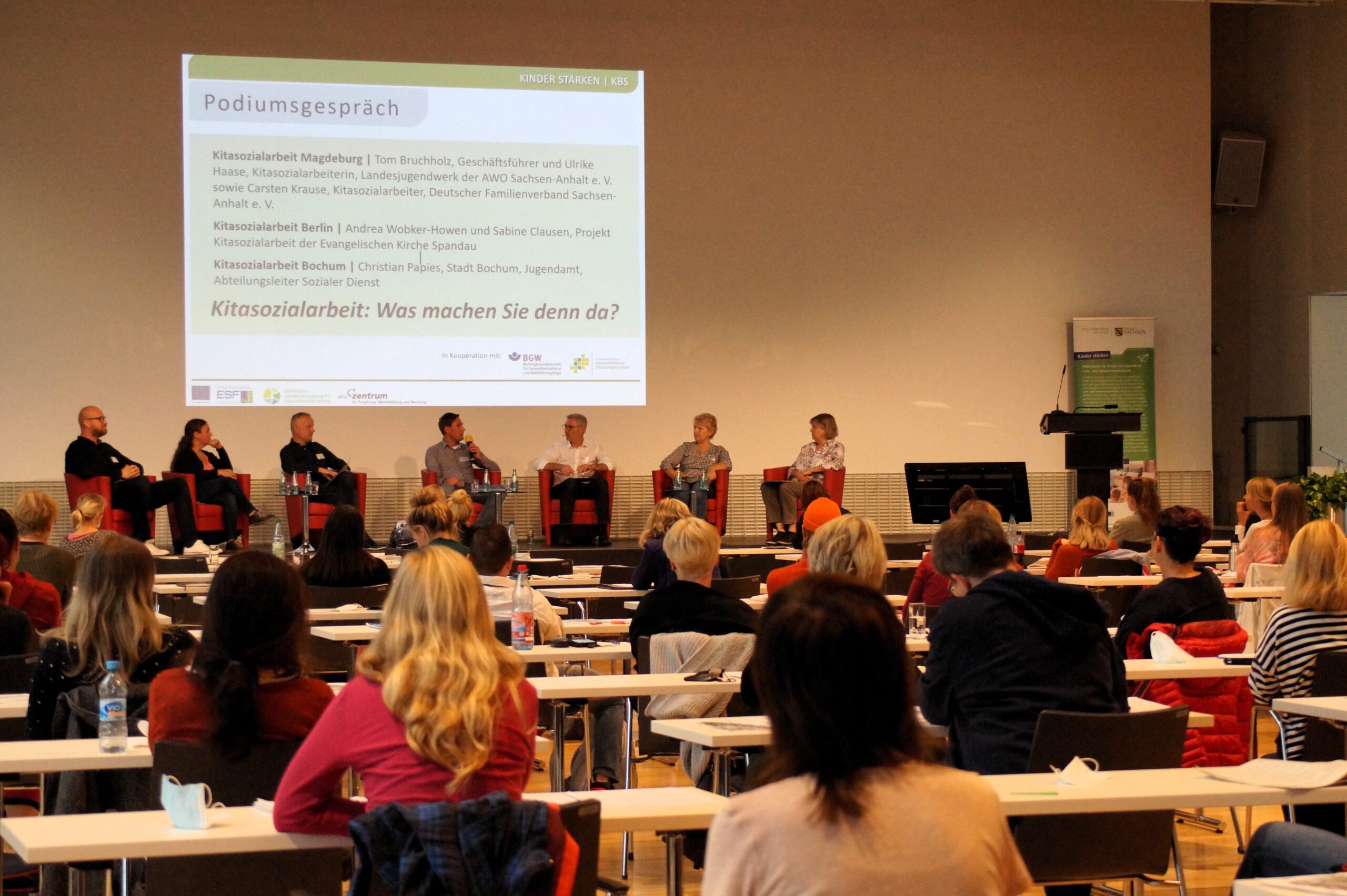 Die fachlichen Impulse von Prof. Wendt wurden nach einer diskussionsfreudigen Pause durch sechs Gäste bei einem Podiumsgespräch aufgenommen und fortgeführt. Eingeladen waren Vertreter*innen von drei bundesweiten Projekten der Kitasozialarbeit: aus Magdeburg Tom Bruchholz und Ulrike Haase vom Landesjugendwerk der AWO Sachsen-Anhalt e. V. sowie Carsten Krause vom Deutschen Familienverband Sachsen-Anhalt e. V., aus Berlin Andrea Wobker-Howen und Sabine Clausen vom Projekt Kitasozialarbeit der Evangelischen Kirche Spandau und aus Bochum Christian Papies vom Sozialen Dienst des Jugendamtes. Aus Sicht des sächsischen ESF-Programms KINDER STÄRKEN interessierte natürlich die Frage, wie Kitasozialarbeit in diesen drei Projekten verstanden und umgesetzt wird. Die Kolleginnen und Kollegen erläuterten, wie deren Projekte strukturiert und regional eingebunden sind, welche Konzepte und Ansätze diesen zugrunde liegen, was unter Kitasozialarbeit verstanden wird und welche Erfahrungen damit gemacht wurden. Das Interesse an differenzierteren Fragestellungen und Diskussionen – auch der Zuhörenden – war groß. Die Ausführungen zeigten, dass unter dem Label Kitasozialarbeit vielfältiges entsteht und es verschiedene Modelle der Umsetzung und Finanzierung gibt. In den Zielen sind sich die Projektgestaltenden sehr nah: Kinder und Eltern bei Lern- und Lebenserschwernissen zur Sicherung von Bildung und Teilhabe zu unterstützen. Am Ende des Podiumsgespräches wurde visionär festgehalten, Kitasozialarbeit in Deutschland auf vielfältige Weise zum Bestandteil der Angebote für Kinder und Familien zu machen und sich zukünftig hierzu gut zu vernetzen und die Zusammenarbeit auszubauen. Kitasozialarbeit muss bundesweit thematisiert und gemeinsam als professioneller Auftrag formuliert werden.