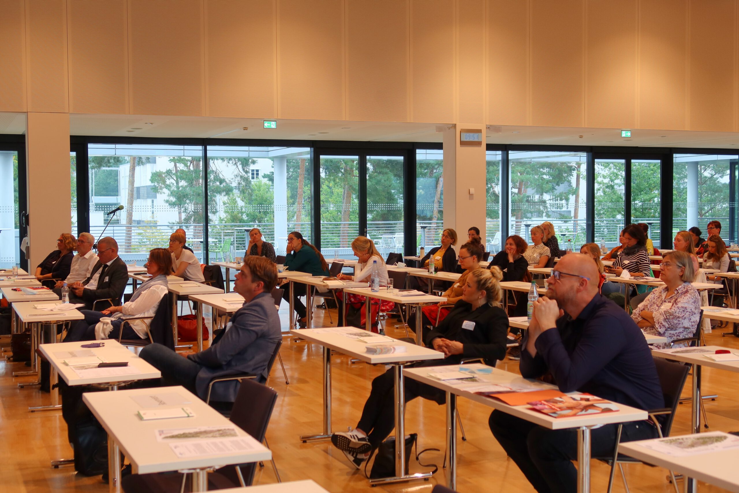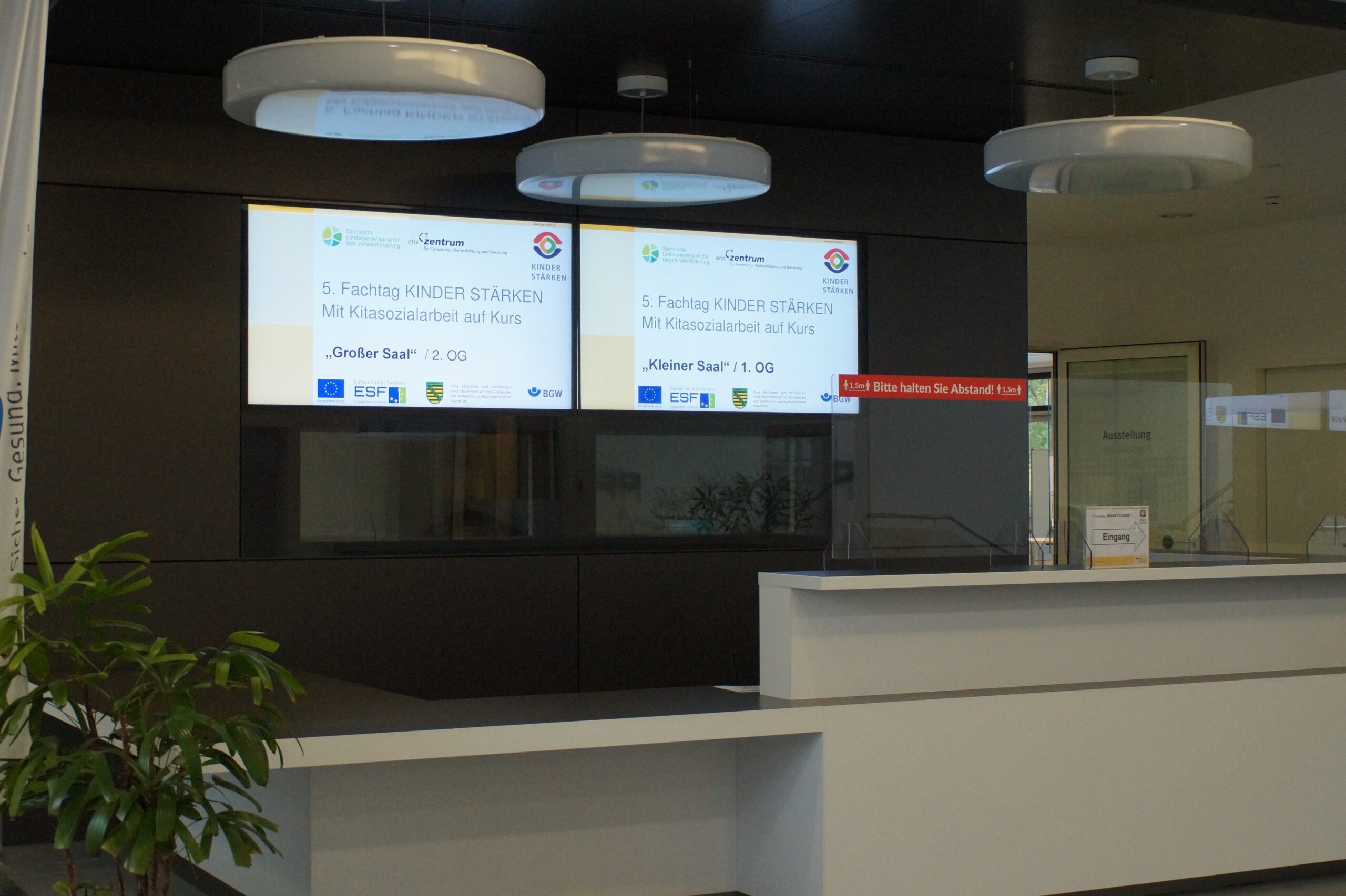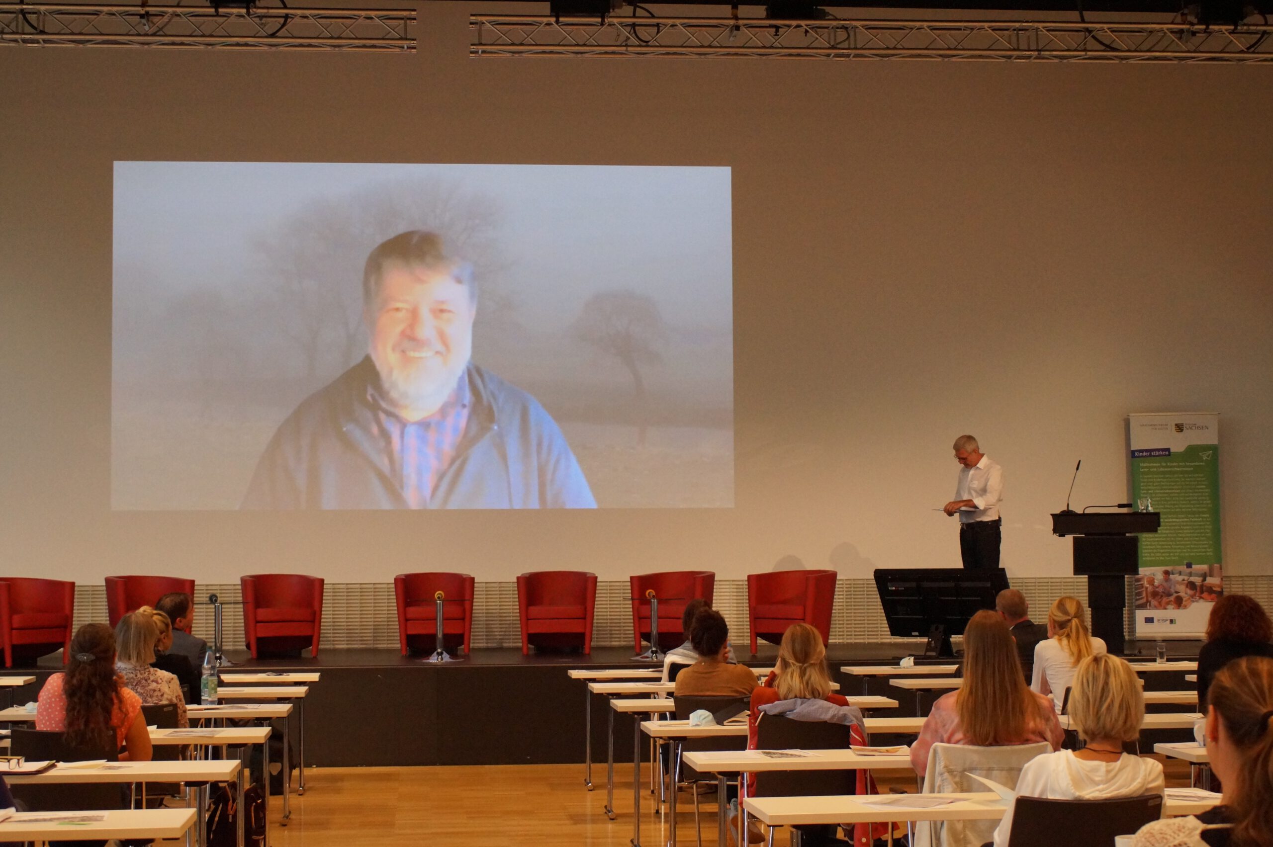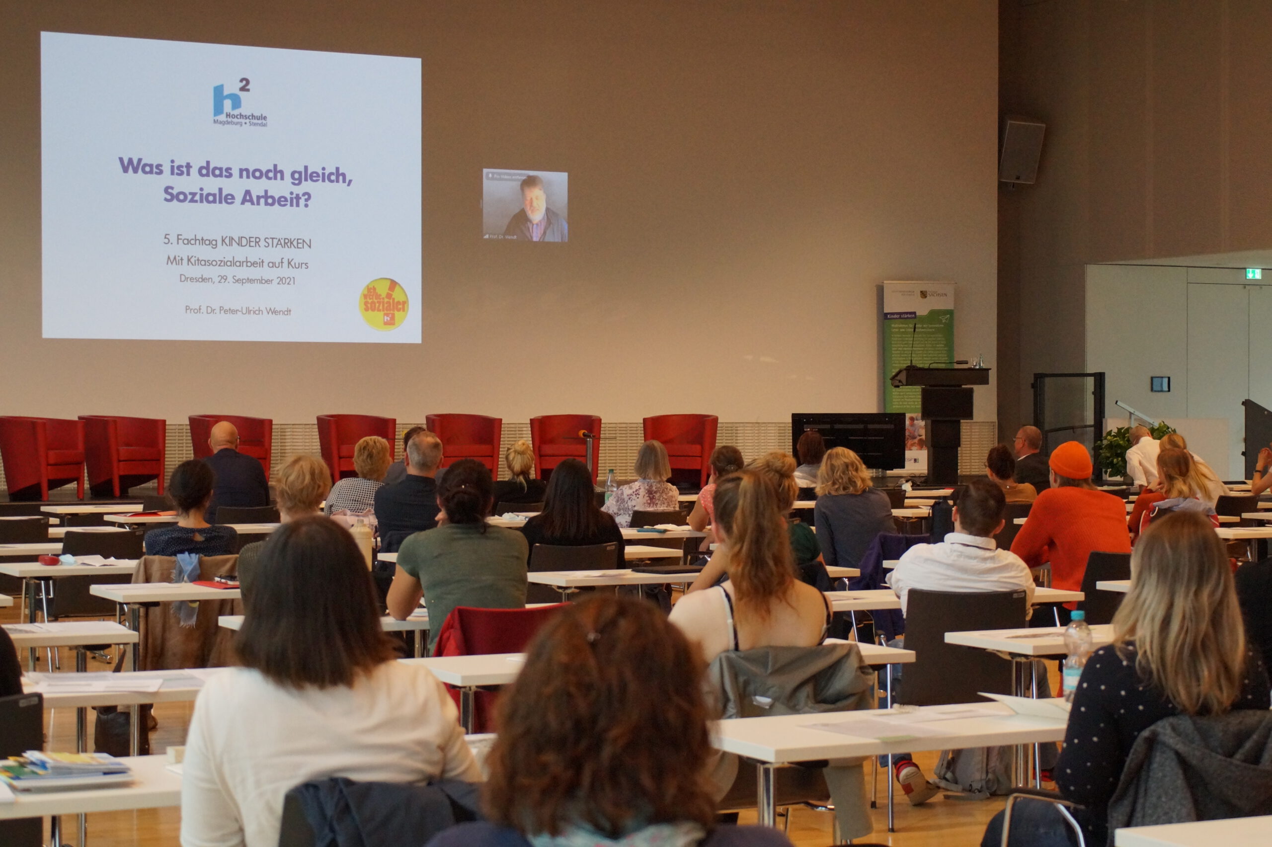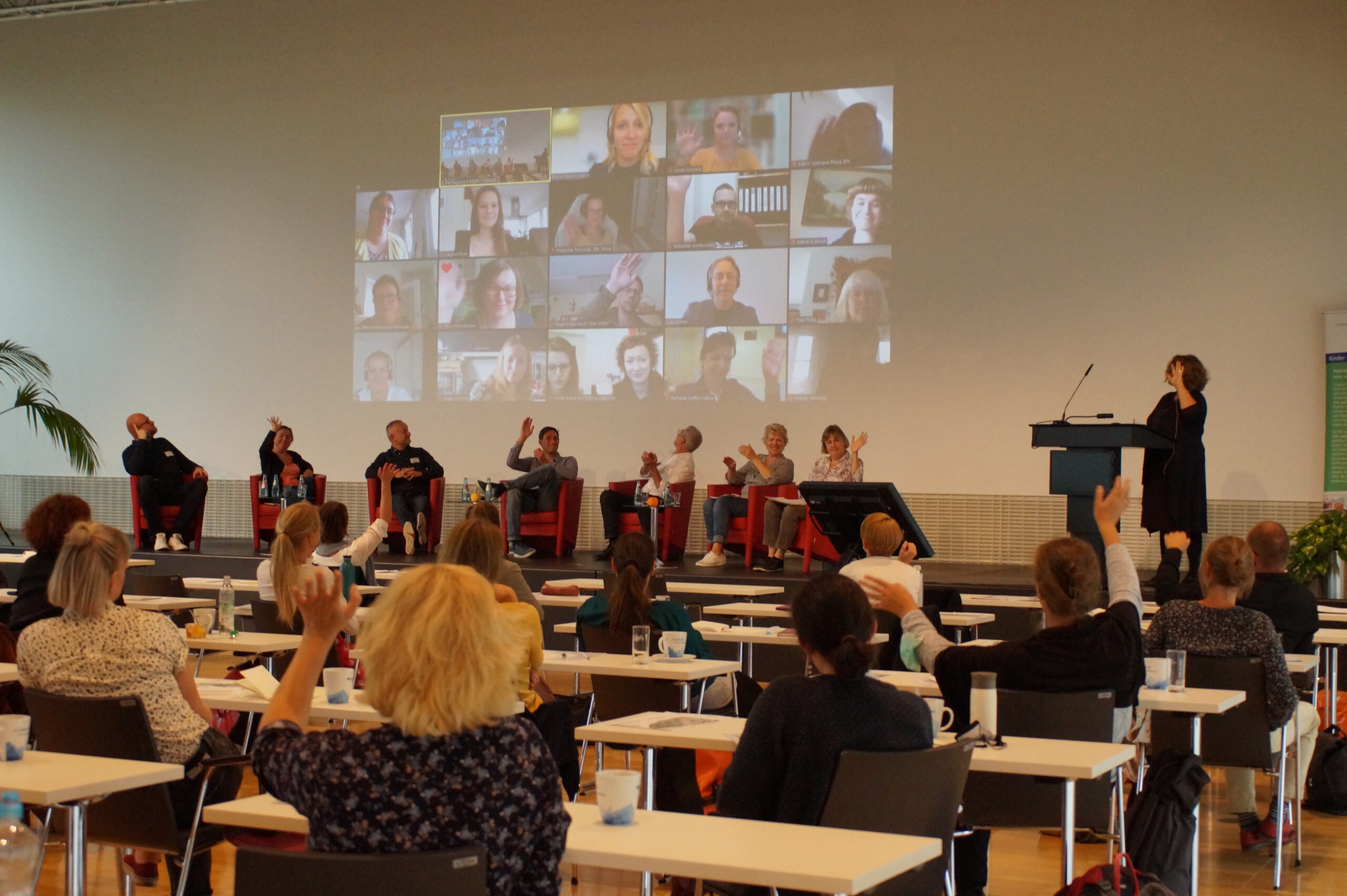 Insgesamt waren etwa 175 Teilnehmende mit Kitasozialarbeit auf Kurs und haben sich auf das Konzept der Hybrid-Veranstaltung eingelassen, so dass ein Austausch vor Ort im DGUV Congress – Tagungszentrum in Dresden sowie an den Bildschirmen möglich war. 100 Kitasozialarbeiter*innen, Einrichtungsleitungen, Trägervertreter*innen und Unterstützer*innen des sächsischen ESF-Programms sowie Gäste aus Politik und Wissenschaft nahmen am Vortrag, dem Podiumsgespräch und am Nachmittag an den Workshops teil. Für etwa 75 Teilnehmende gab es am Vormittag einen Live-Stream vom Programm auf der Bühne direkt ins Zoom-Meeting.