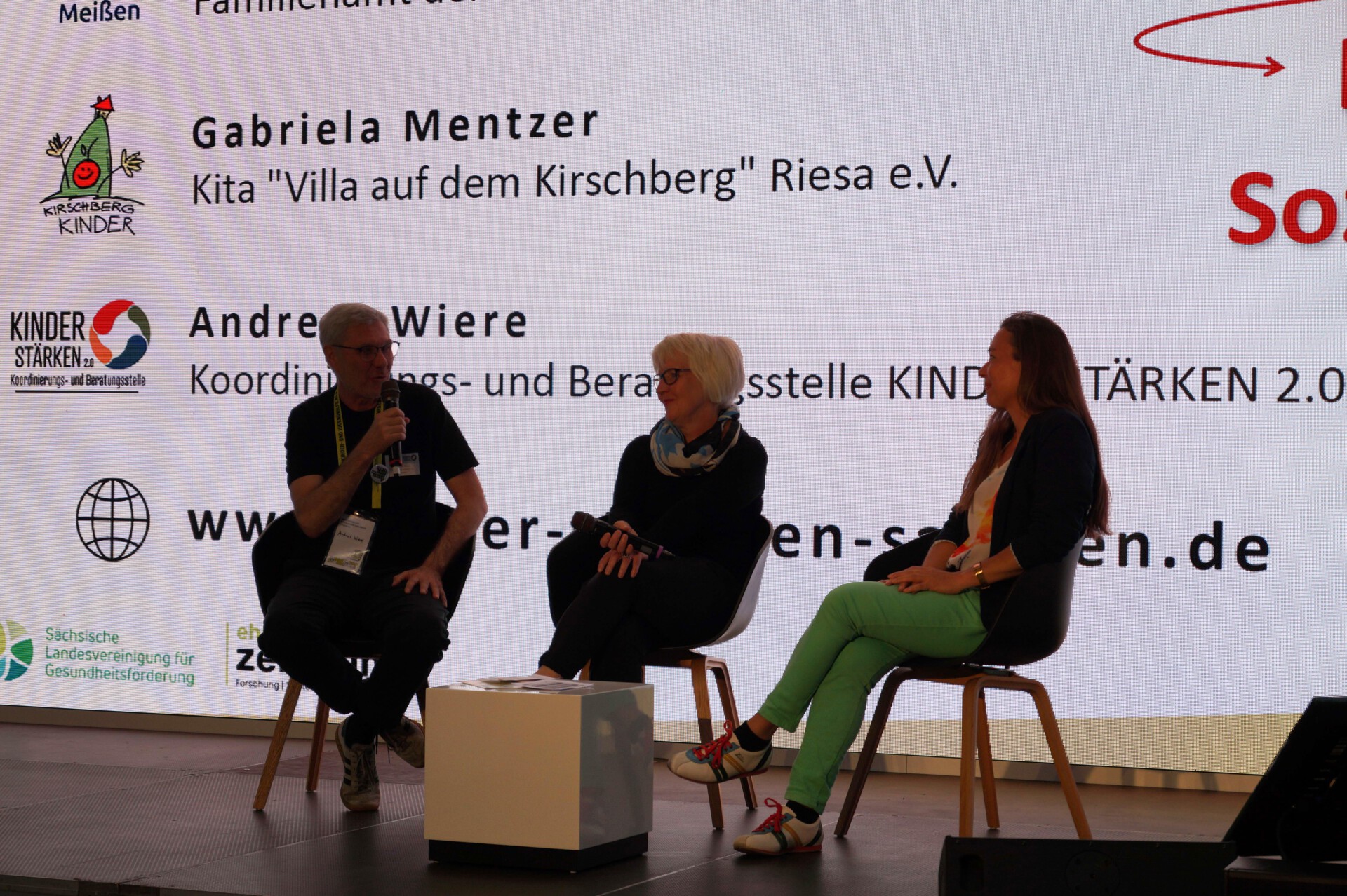 Eindrucksvoll bestätigten dies auch die Podiumsgäste Katrin Nestler (Familienamt der Stadt Meißen) und Gabriela Mentzer (Leiterin der Kita Villa auf dem Kirschberg in Riesa) im Gespräch mit Andreas Wiere (KBS) auf der Bühne des Freistaates Sachsen.