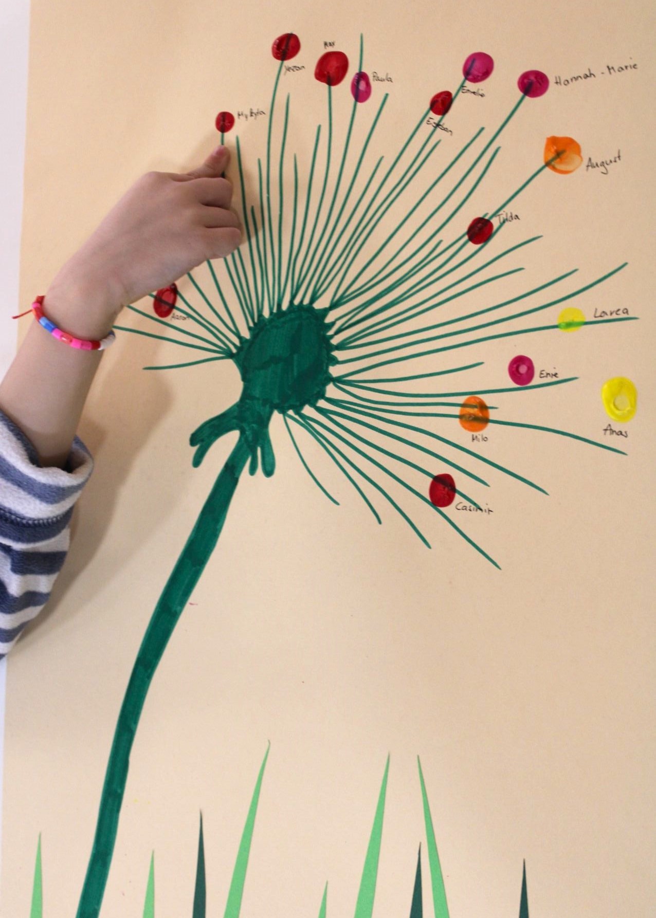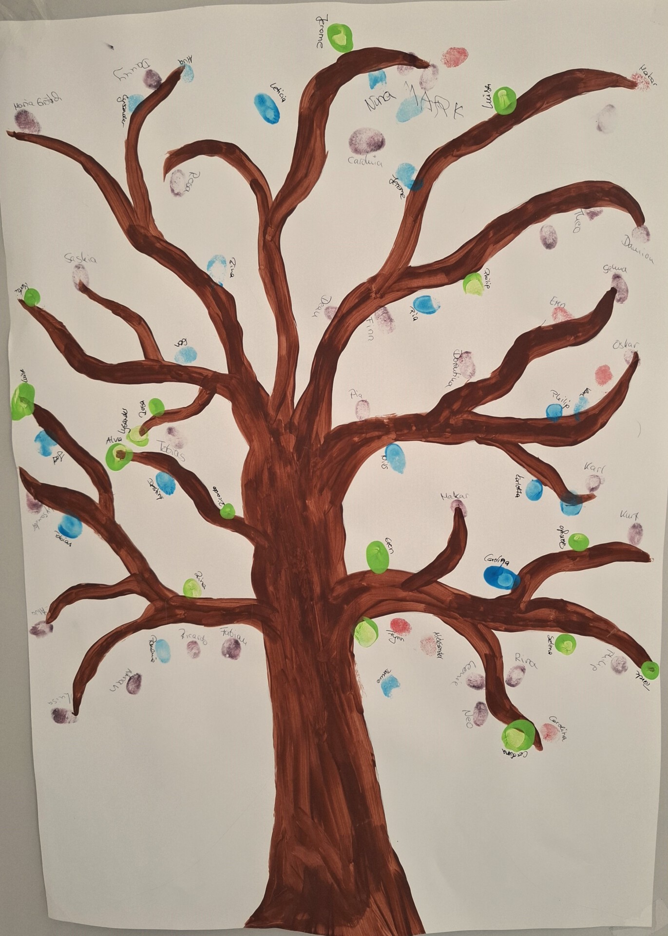 Auf Grund der großen Resonanz bei der Rückmeldung führten wir den ersten Treff in unserer Mensa durch. Zwei pädagogische Fachkräfte unterstützten die Leitung und mich. Ein Kreativangebot wurde vorbereitet und Mal- und Spielsachen bereitgelegt. Beim Ankommen bekamen die Kinder ein Namensschild und hinterließen ihren Daumenabdruck an unserem Willkommensbaum. Die Teilnehmendenzahl war überwältigend – über 50 Kinder kamen mit ihren Eltern. Es war eine spannende Herausforderung, alles zu koordinieren und mit so vielen Kindern und Eltern ins Gespräch zu kommen.