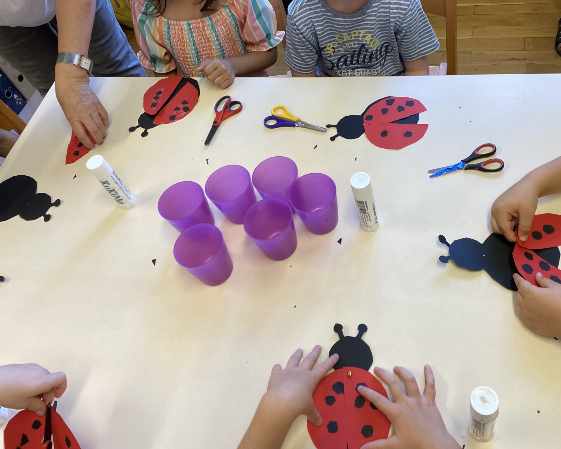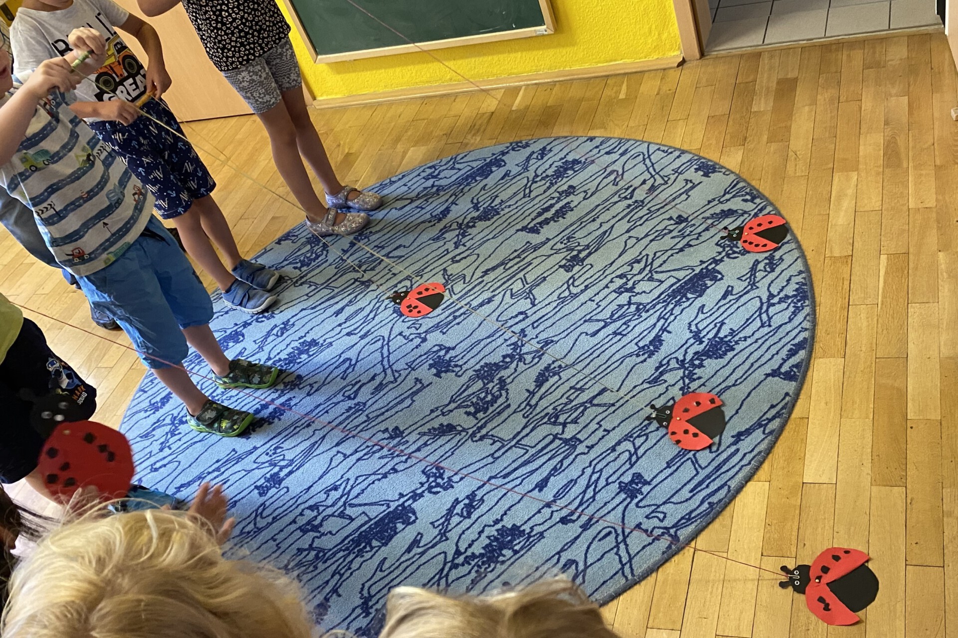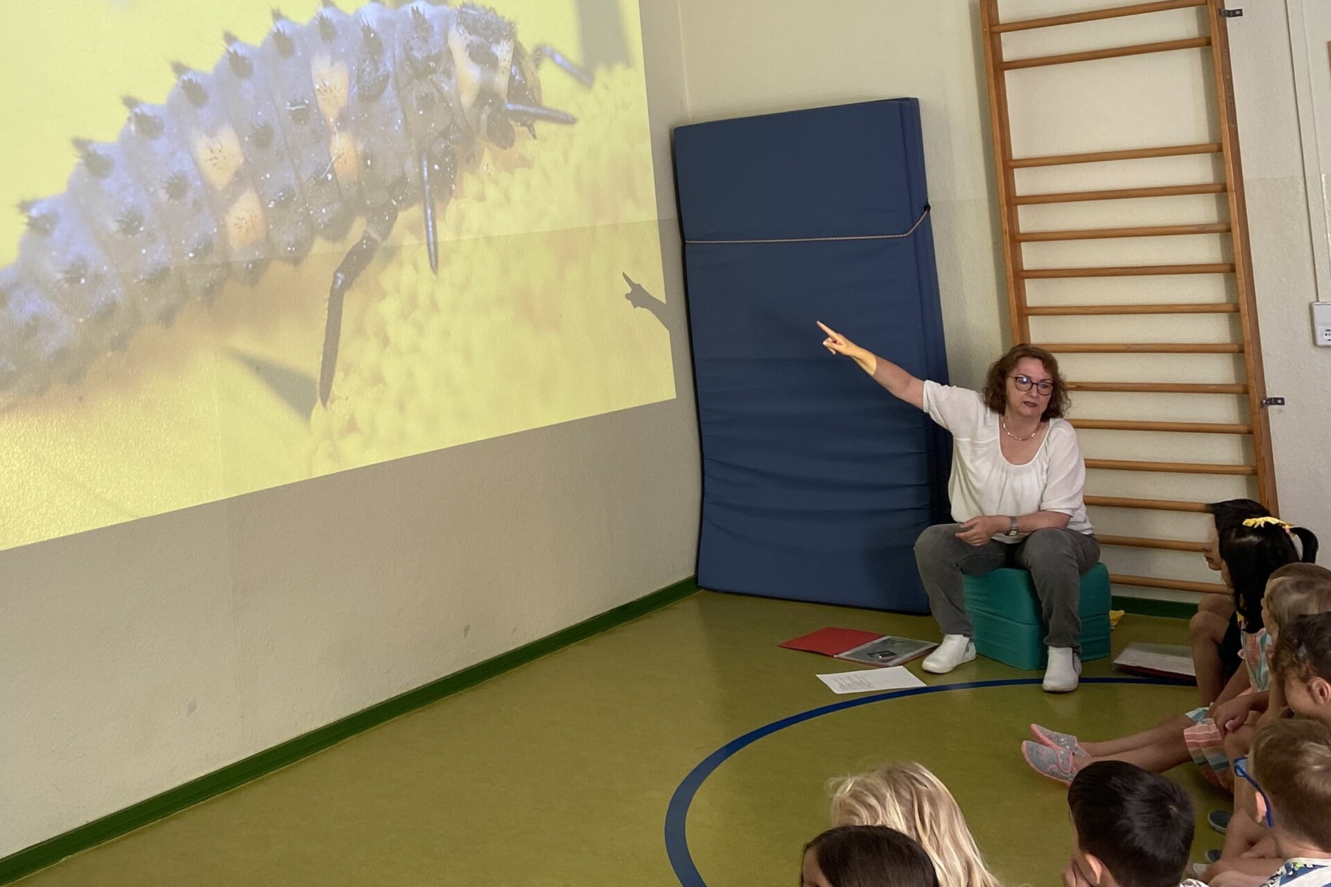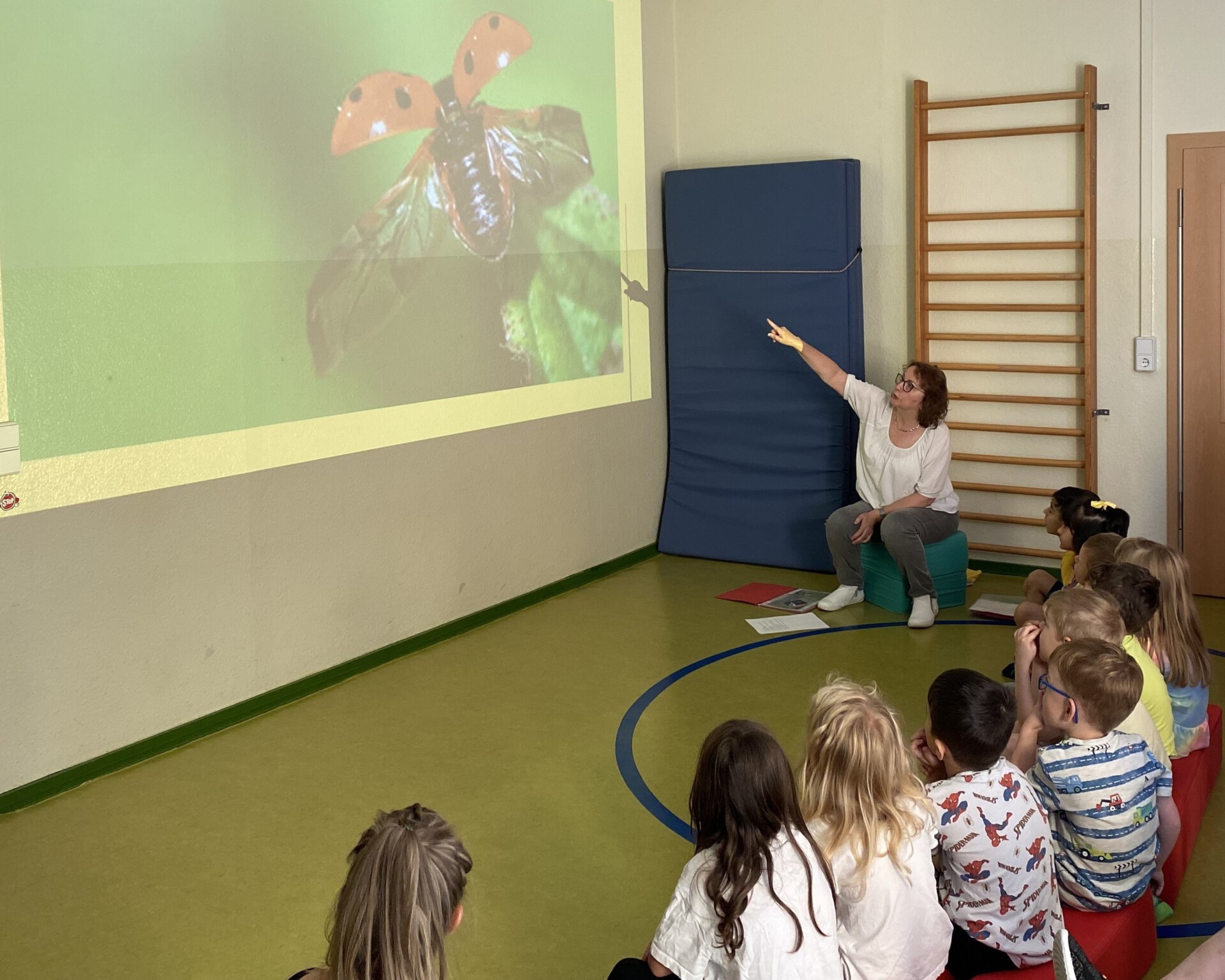 Haben sie schon als junge Käfer ihre rote Farbe und die Punkte? Das war nur eine der vielen Fragen der Kinder. Schnell war klar: fachliche Expertise musste her. Dafür aktivierte ich als zusätzliche Fachkraft im Programm KINDER STÄRKEN 2.0 die Kooperation mit unserem Netzwerkpartner Naturschutzbund (NABU). Das Projekt Marienkäfer wurde dadurch erweitert und vertieft. Im August 2024 war es so weit: In unserem Turnraum empfingen wir mit den Vorschulkindern das NABU-Team. Sie vermittelten den Kindern zuerst mit großformatigen Naturaufnahmen viel Wissenswertes über die verschiedenen Entwicklungsstadien des Marienkäfers. Dann folgte eine lustige Kurzgeschichte, inspiriert von der Geschichte Der kleine Käfer Immerfrech von Eric Carle. Zum Schluss bastelten alle Kinder einen eigenen Käfer. Den Geschwindigkeitswettbewerb bestanden alle Käfer mit Bravour. Wer anfangs gut zugehört hatte, bekam nach einem kleinen Wissensquiz eine Expertenmedaille. Natürlich hatten das alle.