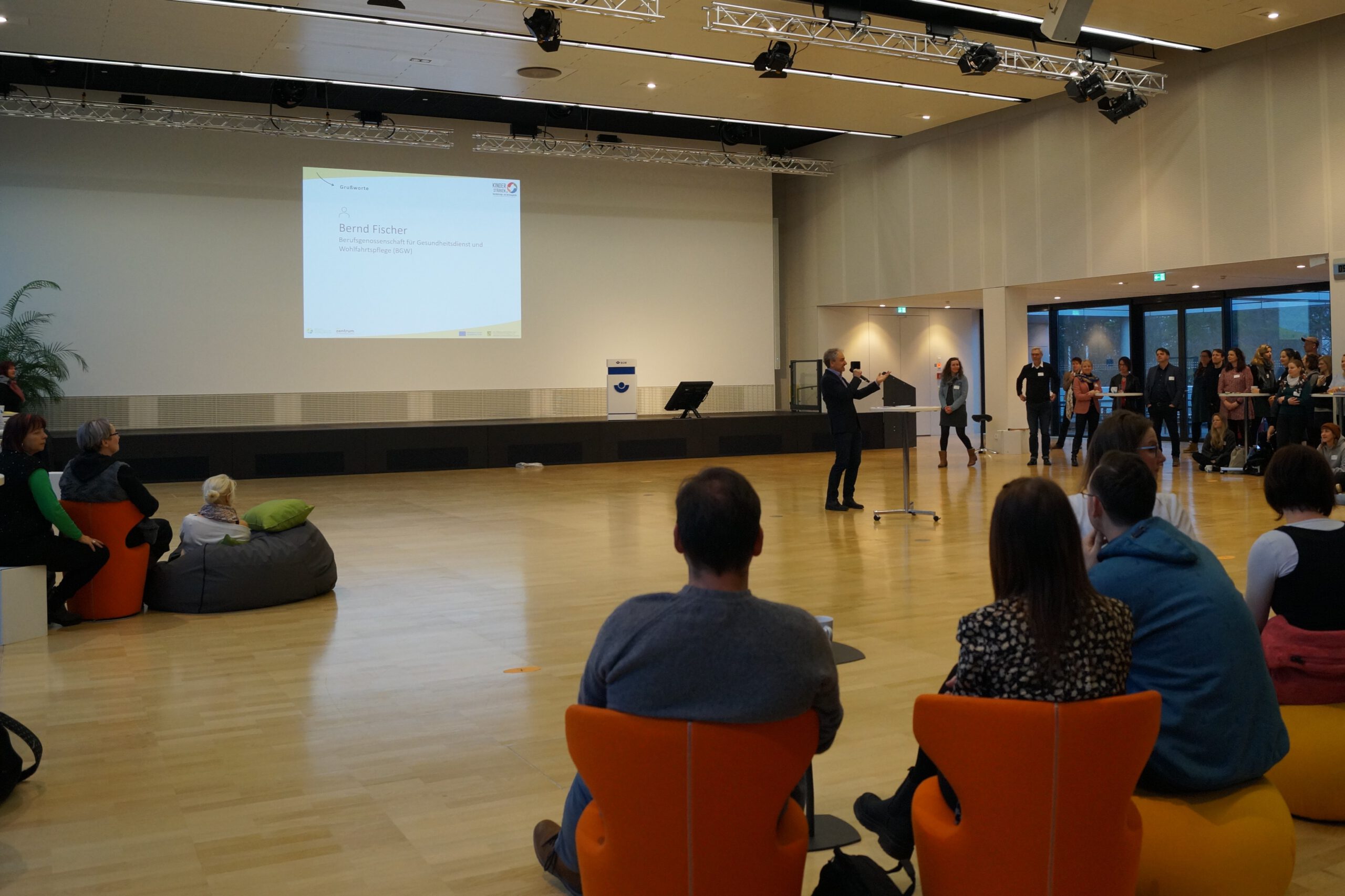 Nach der Eröffnung richtete Bernd Fischer von der Berufsgenossenschaft für Gesundheitsdienst und Wohlfahrtspflege (BGW) herzliche Grußworte an die Gäste. Die BGW ist Kooperationspartner der Sächsischen Landesvereinigung für Gesundheitsförderung e. V. (SLfG) und unterstützt KINDER STÄRKEN seit mehreren Jahren in der organisatorischen Umsetzung des Fachtages.
