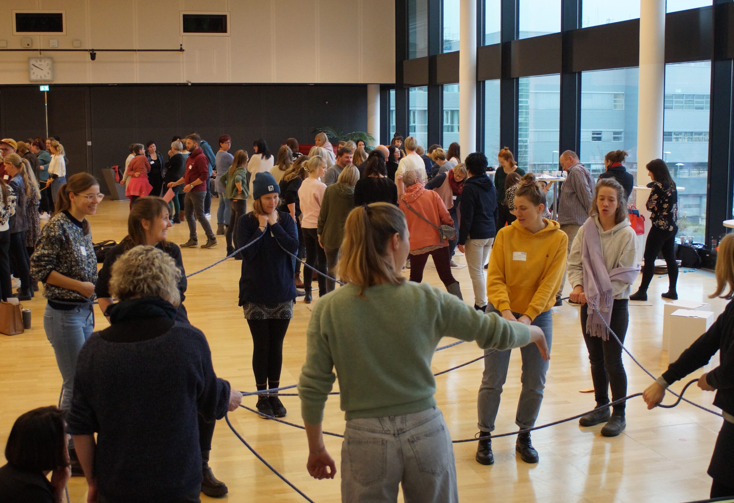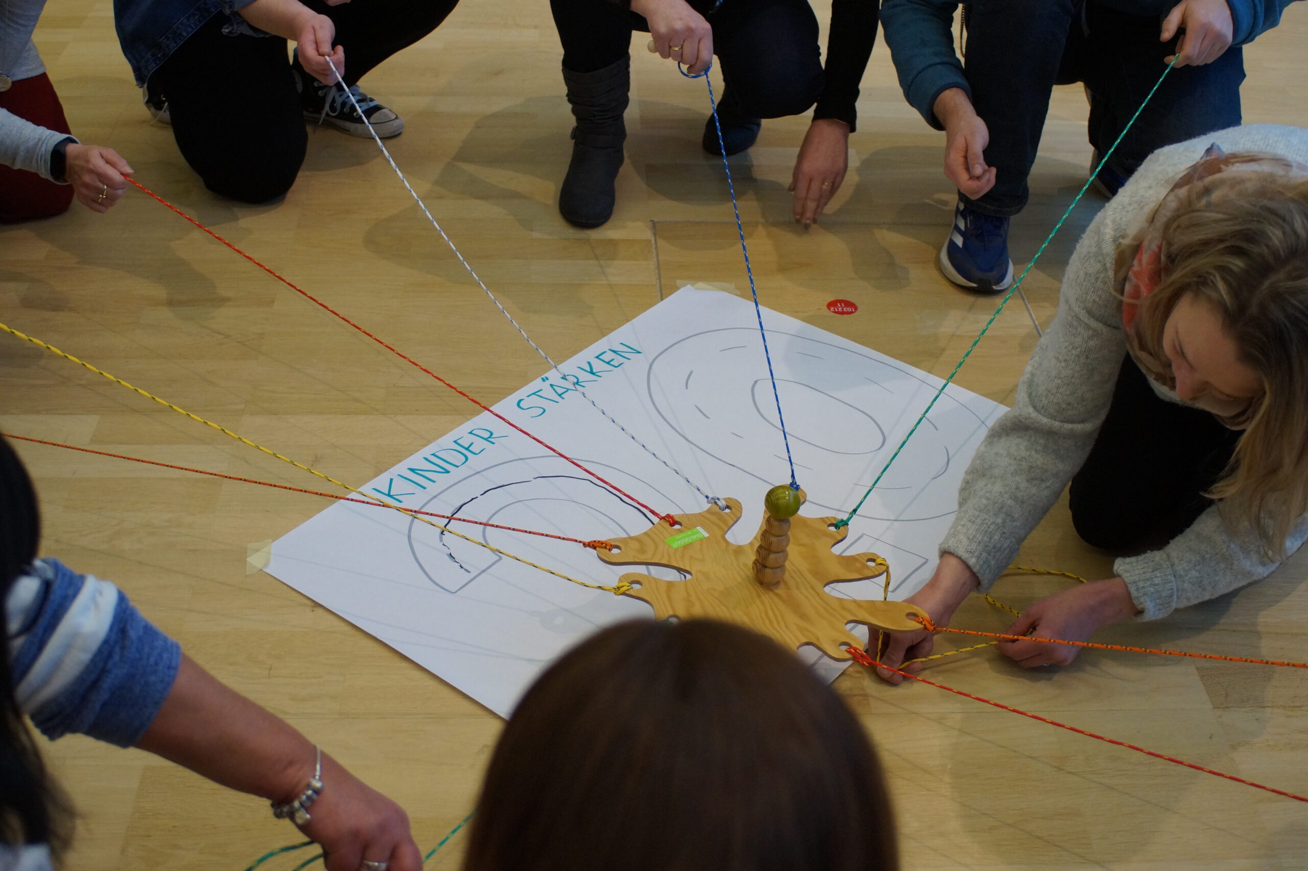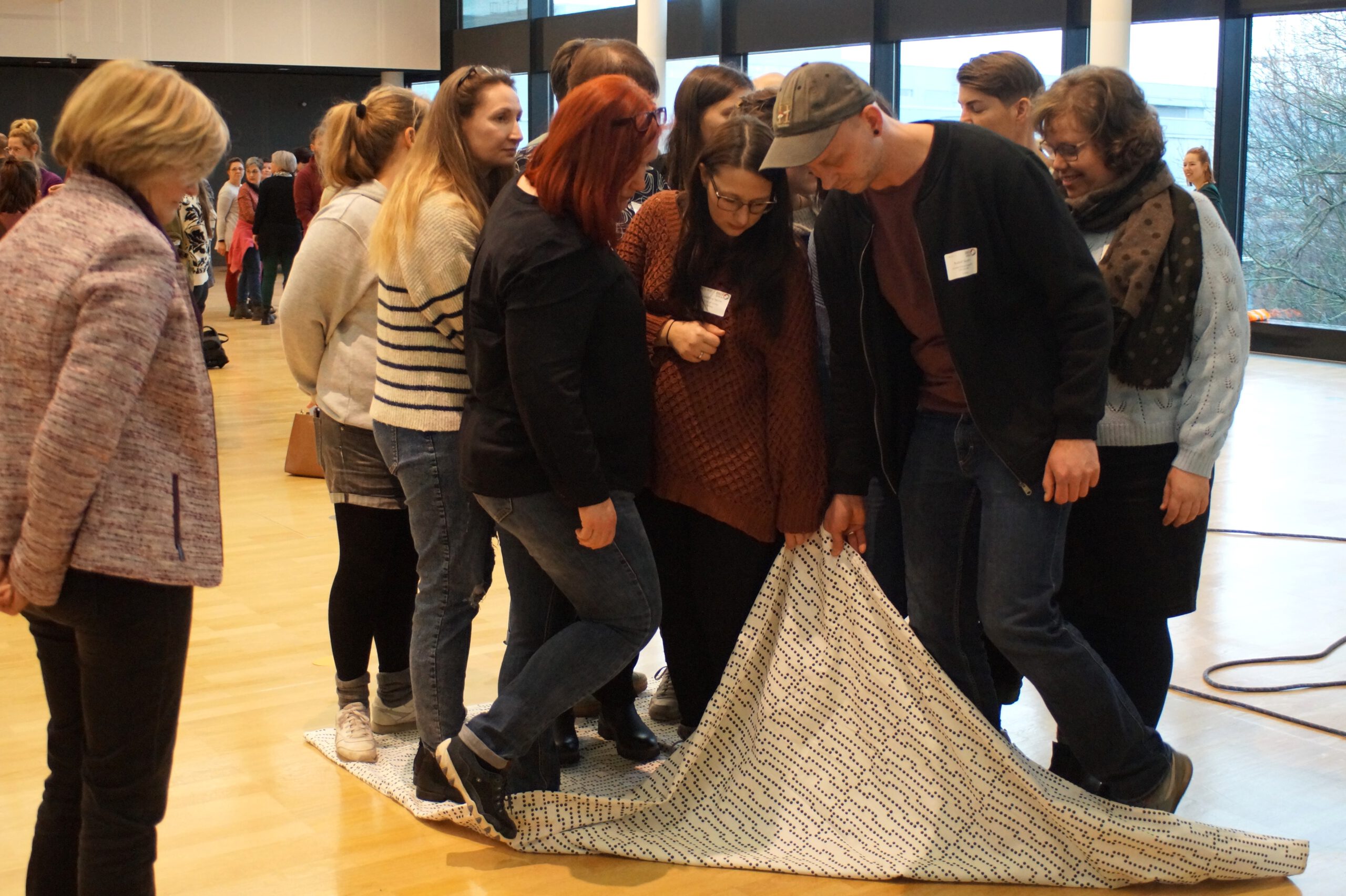 Zum gemeinsamen Einstieg gruppierten sich die Kitasozialarbeiter:innen anhand ihrer regionalen Zugehörigkeiten. Die Gruppen wurden jeweils von einem KBS-Koordinator bzw. einer Koordinatorin in ein Interaktionsspiel eingeführt. In den nächsten zwanzig Minuten lernten sich die Kitasozialarbeitende auf anderem Terrain kennen. Zum Beispiel erforderte es Geschicklichkeit und Abstimmung innerhalb einer Gruppe, um einen längeren Stab gemeinsam und regelkonform auf dem Boden abzulegen. Soziale Kompetenzen, aber auch Humor waren die Schlüssel auch in den anderen Gruppen, z. B. beim Plane wenden, im XXL-Teamband, beim perfekten Quadrat, der Pipeline. Für die Kitasozialarbeitenden waren die Interaktiven Methoden gleichzeitig Impulse für die eigene Arbeit.
