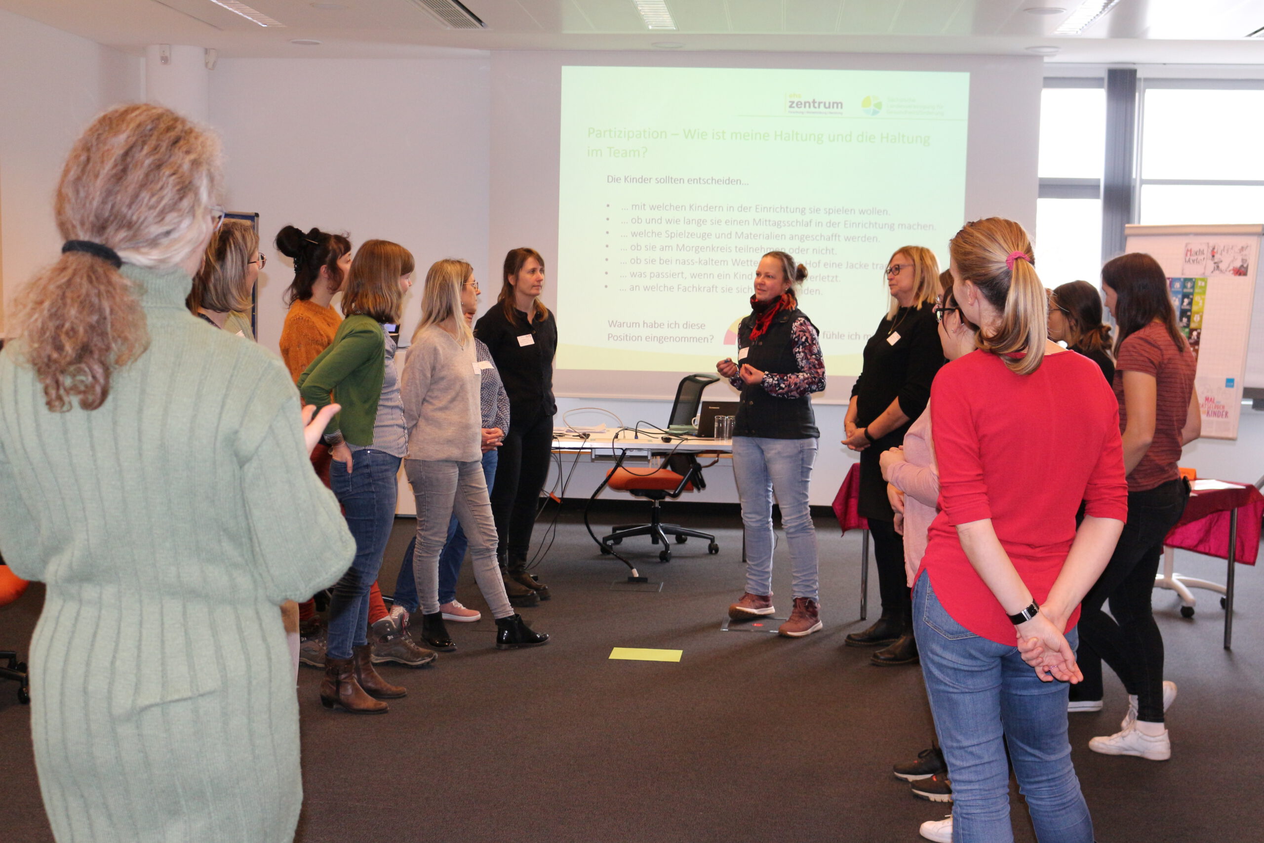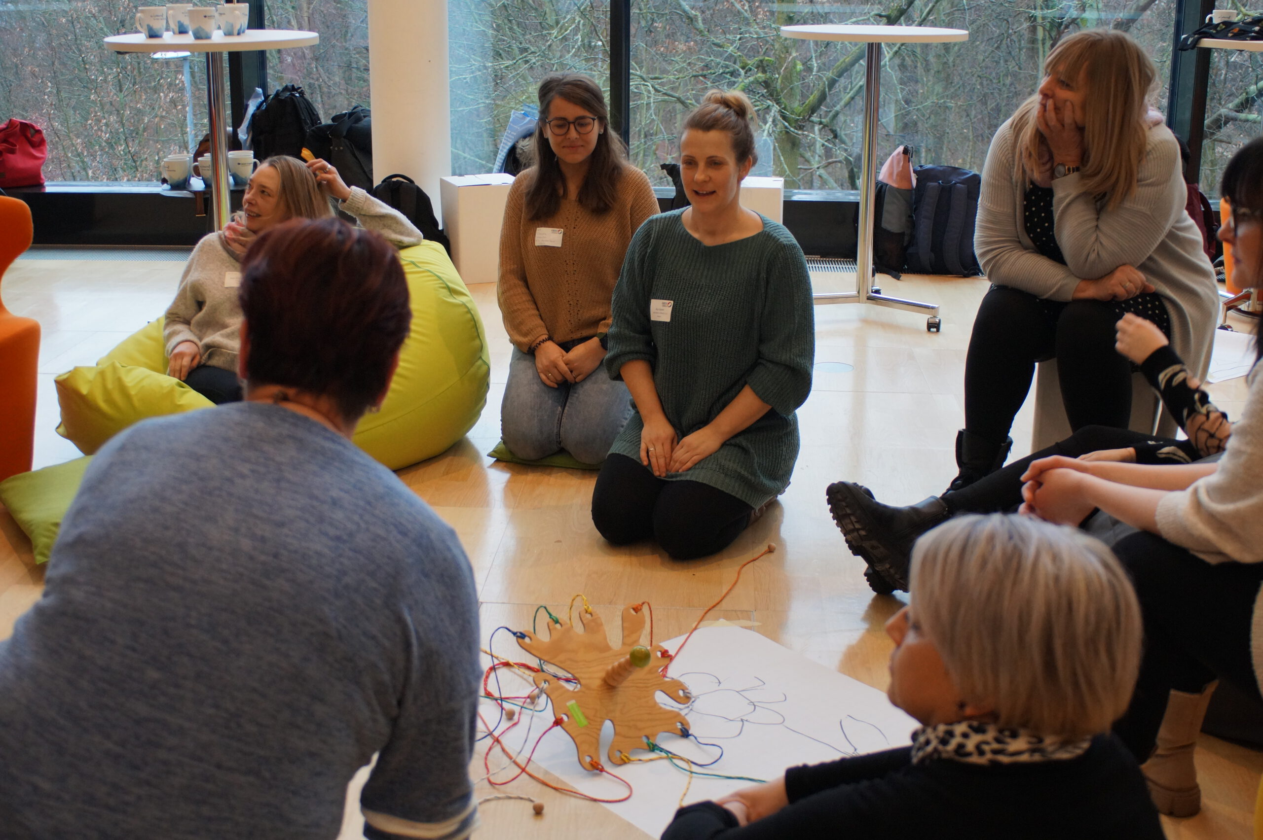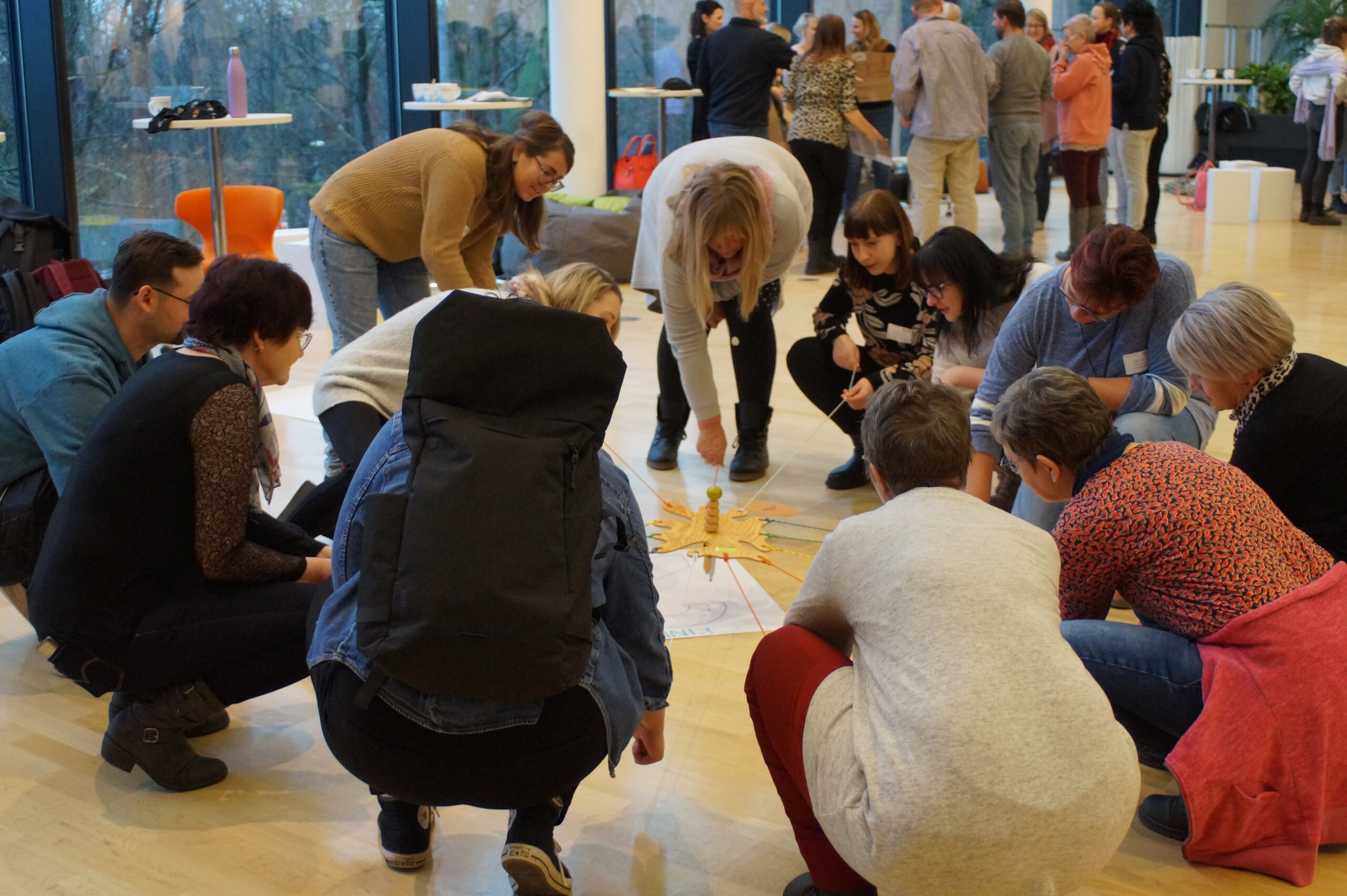 Zum gemeinsamen Einstieg gruppierten sich die Kitasozialarbeiter:innen anhand ihrer regionalen Zugehörigkeiten. Die Gruppen wurden jeweils von einem KBS-Koordinator bzw. einer Koordinatorin in ein Interaktionsspiel eingeführt. In den nächsten zwanzig Minuten lernten sich die Kitasozialarbeitende auf anderem Terrain kennen. Zum Beispiel erforderte es Geschicklichkeit und Abstimmung innerhalb einer Gruppe, um einen längeren Stab gemeinsam und regelkonform auf dem Boden abzulegen. Soziale Kompetenzen, aber auch Humor waren die Schlüssel auch in den anderen Gruppen, z. B. beim Plane wenden, im XXL-Teamband, beim perfekten Quadrat, der Pipeline. Für die Kitasozialarbeitenden waren die Interaktiven Methoden gleichzeitig Impulse für die eigene Arbeit.