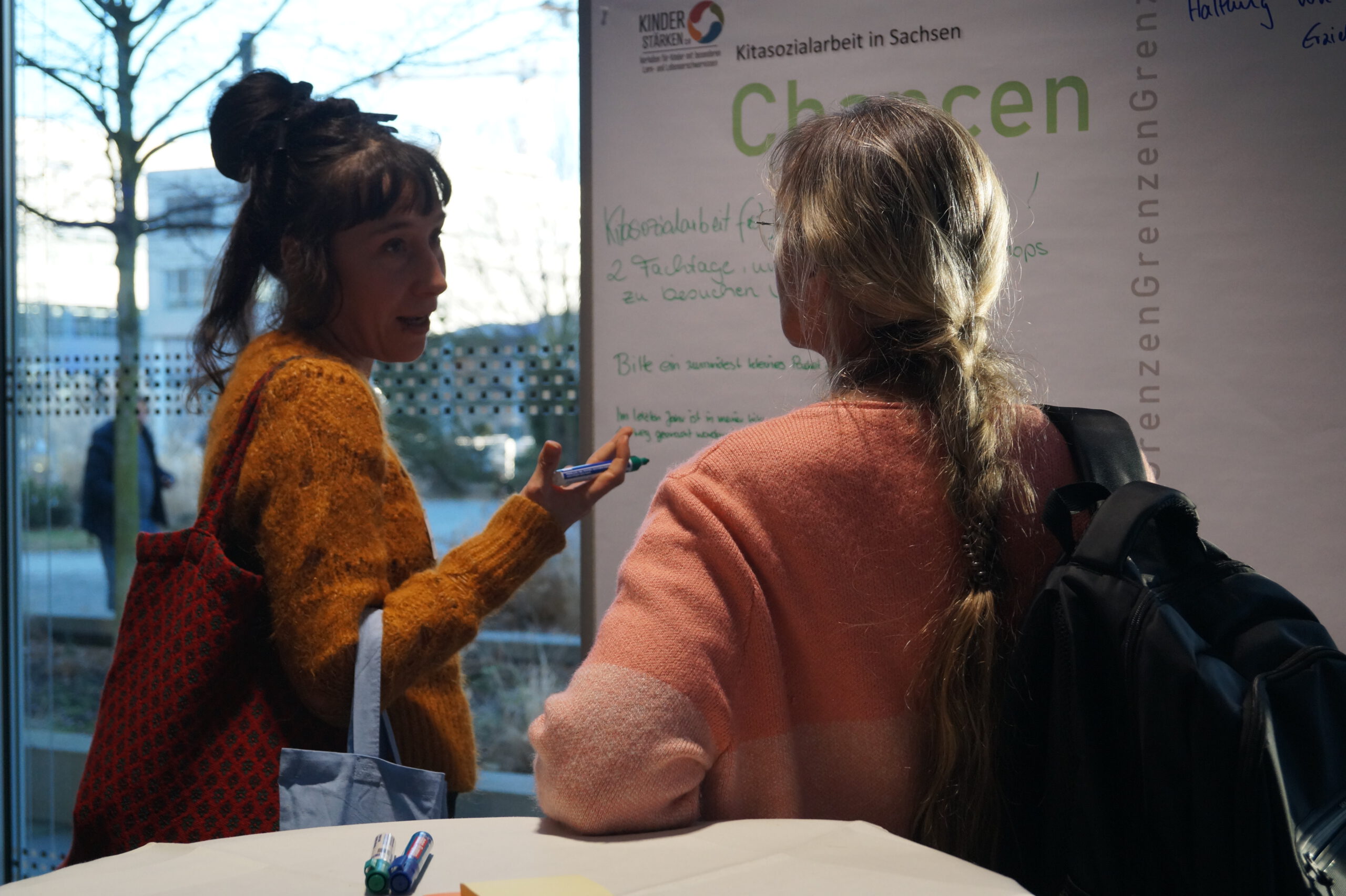 Interessant vor allem für die Programmfachkräfte, die als Kitasozialarbeitende im Hort tätig sind, war der Workshop Sozialarbeit in Grundschule und Hort. Betrachtet wurden Zielstellungen, Arbeitsprinzipien und Handlungsfelder von Schulsozialarbeit und Kitasozialarbeit im Hort. Die Teilnehmenden diskutierten, inwieweit sich hier Gemeinsamkeiten, Unterschiede, Abgrenzungen und Synergien ergeben. Im Austausch wurde deutlich, dass die Zusammenarbeit an Standorten mit Schul- und Kitasozialarbeit in den allermeisten Fällen gut und für beide Seiten zufriedenstellend läuft. Formen, Möglichkeiten sowie Themen der Zusammenarbeit werden vor allem standortbezogen zwischen konkreten Akteuren gestaltet. Für die Akteure der Kita- bzw. Hortsozialarbeit ergab sich insbesondere die Frage der Haltung zu und des Umgangs mit sogenannten „schulischen Themen“.