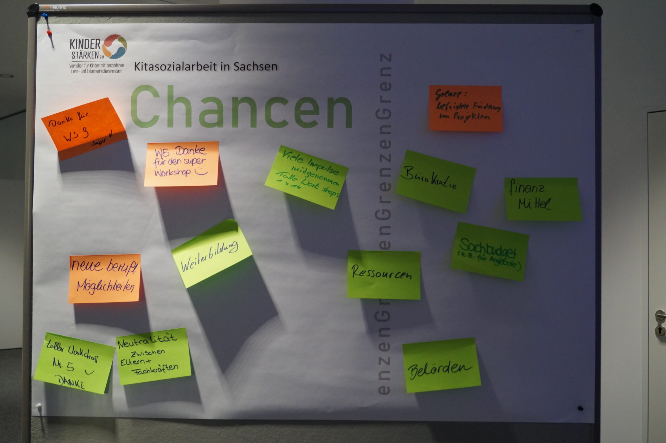 Nach der zweiten Workshoprunde am Nachmittag wurde der Fachtag im lockeren Austausch durch Statements und Blitzlichter aus den Workshops beendet. Dazu wurden Pinnwände beschrieben und die Teilnehmenden resümierten die Workshop-Inhalte in kleinen Gruppen. „Danke für die gut ausgewählten und informativen Workshops“ war oft zu hören. Auch der Austausch mit den anderen Kitasozialarbeitenden wurde als wertvoll hervorgehoben.