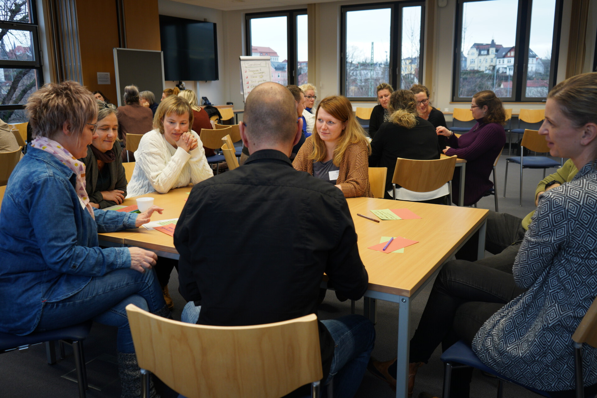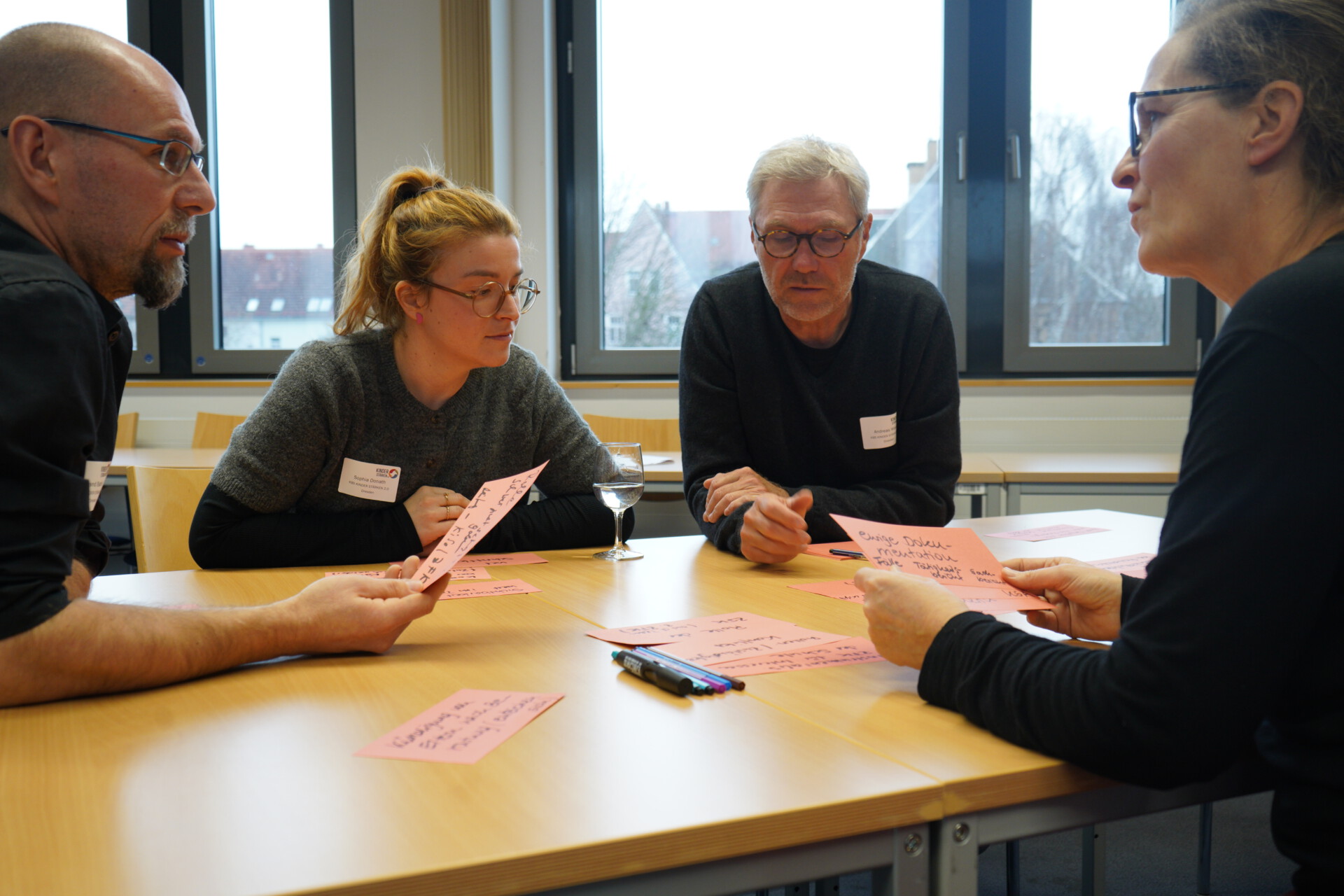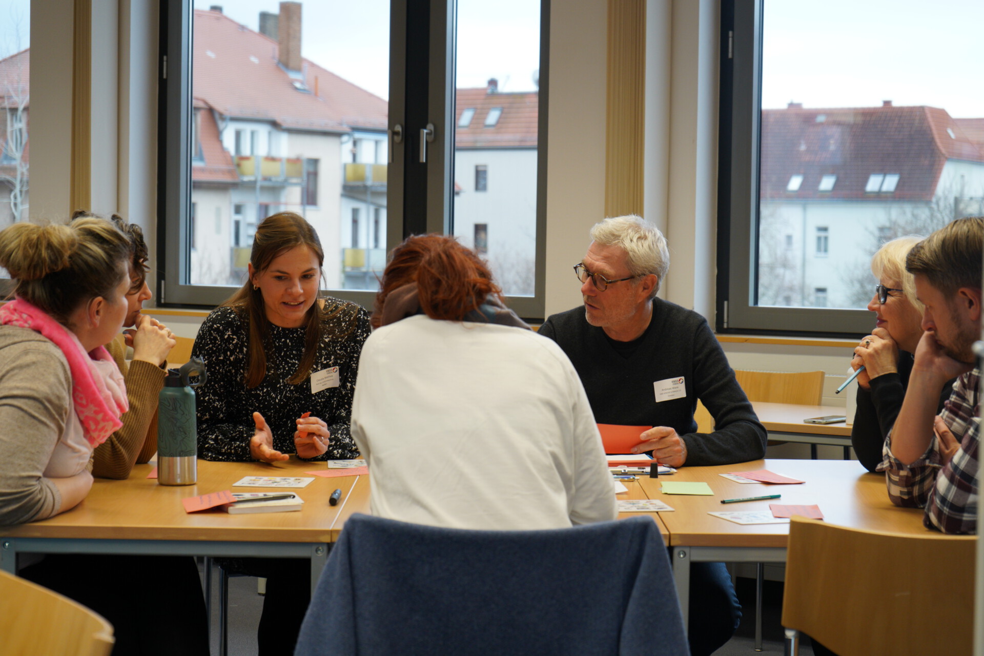 Nach einer herzlichen Begrüßung durch das Koordinator:innen-Team und die Projektleitung der Koordinierungs- und Beratungsstelle hatten die Teilnehmenden die Möglichkeit, sich moderiert und in kleineren Gruppen auszutauschen. Hierbei wurden sowohl die Herausforderungen als auch die Ressourcen und Gelingensmomente im Projekt thematisiert. Der Vorteil dieses Formats lag vor allem im Perspektivwechsel, den die Kita-Leitungen durch die Einblicke in die Arbeitsweisen und Strategien ihrer Kolleginnen und Kollegen erhielten.