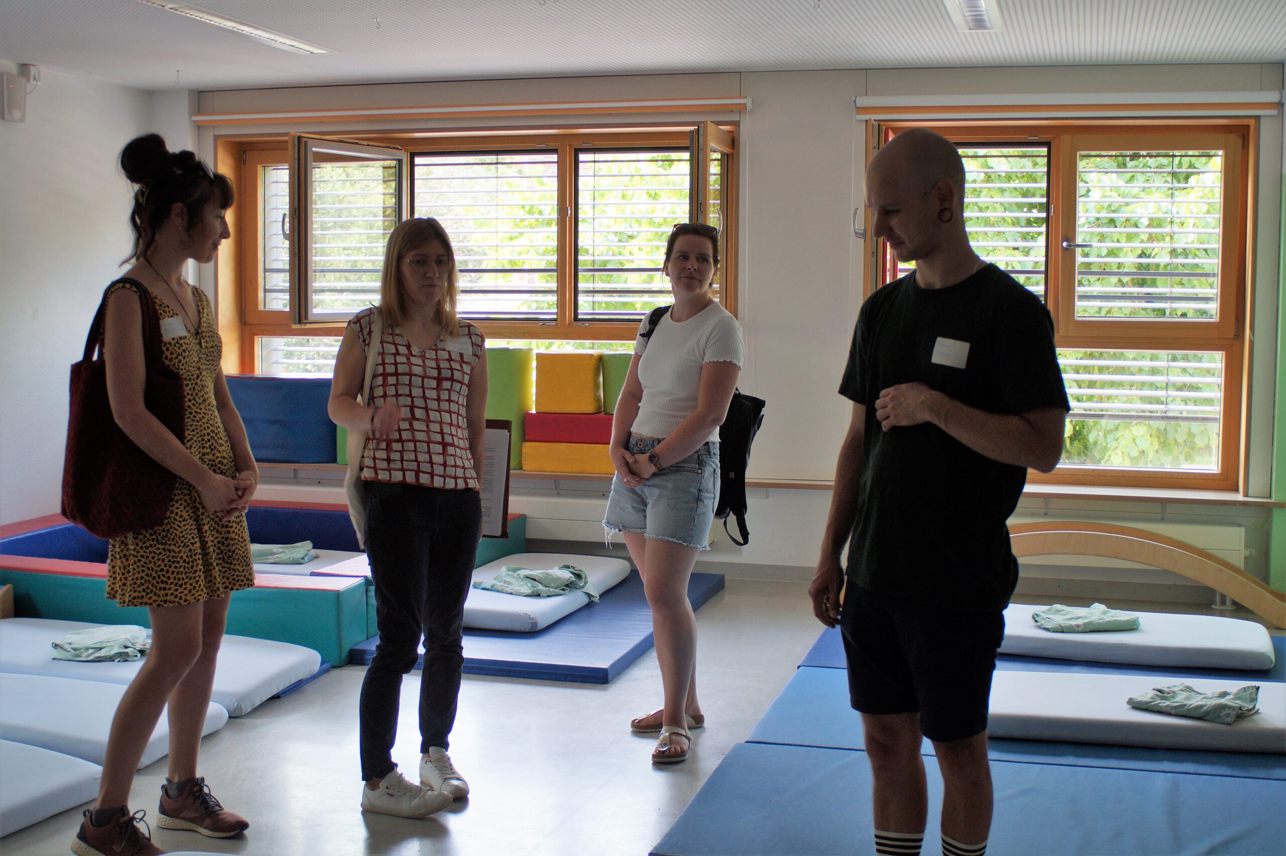 Bereits beim Gang durch die Kita kamen die Kitasozialarbeiter:innen in einen regen Austausch und in jedem Raum ergaben sich neue Fragen, u. a. zu Möglichkeiten der Partizipation der Kinder, zur Form der Essensversorgung, zur Zahnhygiene, zur Wachgruppe. Der Gastgeber beschrieb das offene und kindzentrierte Konzept und den Tagesablauf, der sich daran orientiert. Etabliert haben sich die sogenannten Mittagskreise mit festen altersgleichen Kindergruppen und den jeweiligen Bezugsfachkräften, der individuelle Umgang mit den Schlafbedürfnissen sowie ein rotierendes Obst- und Gemüsesystem, bei dem sich die Kinder über Bilderkarten entscheiden, welche Sorte die Eltern für die nächste gemeinsame Vesper für alle mitgeben.