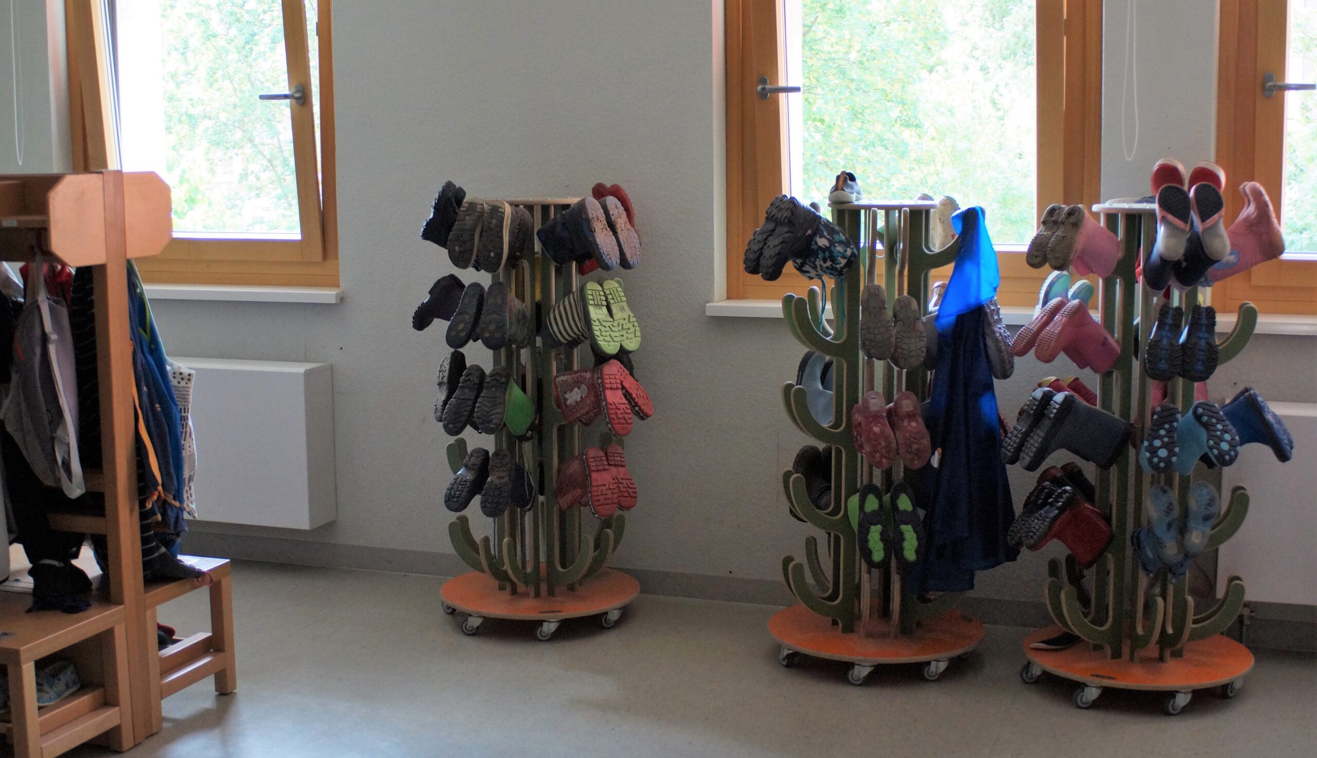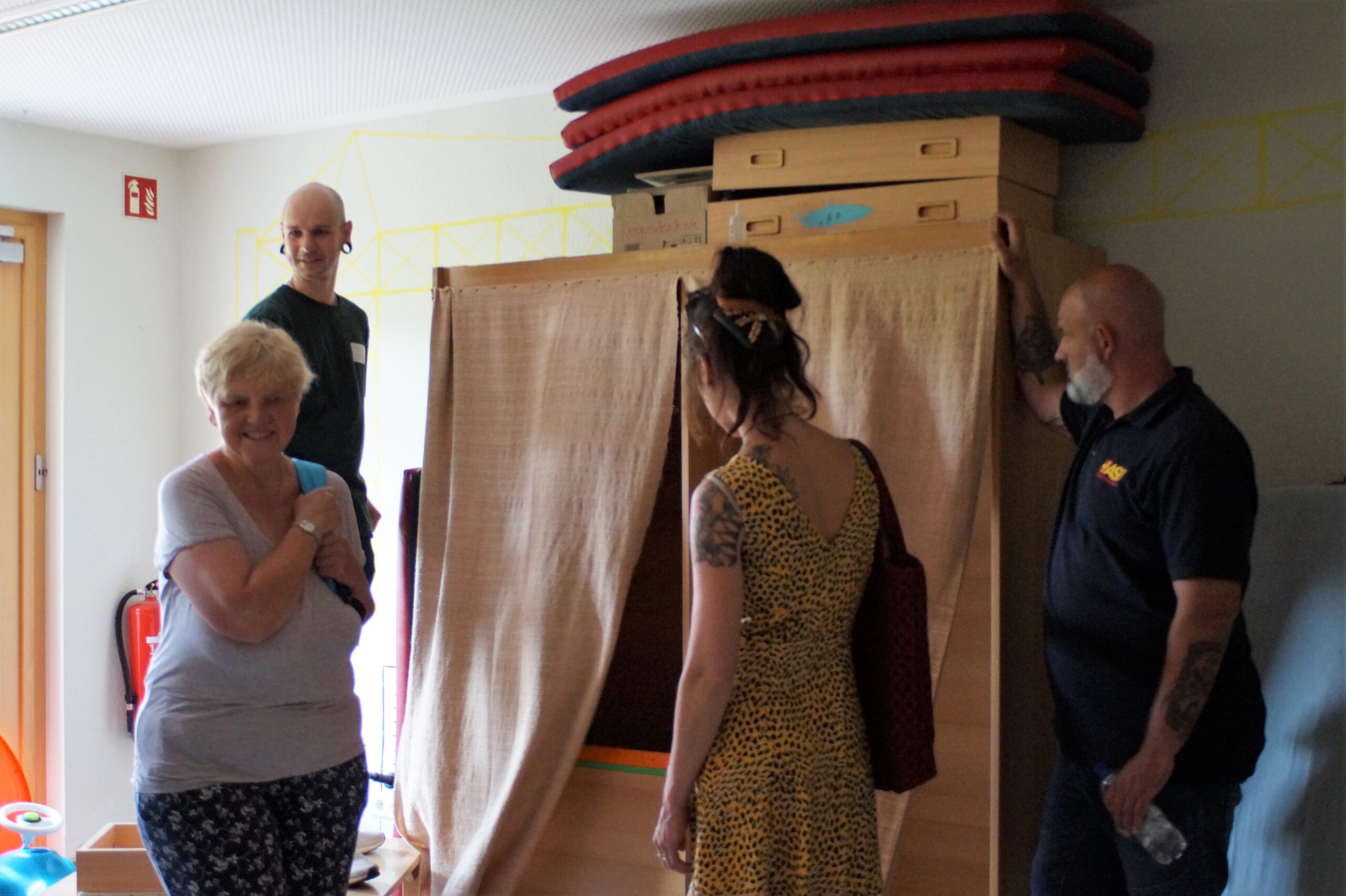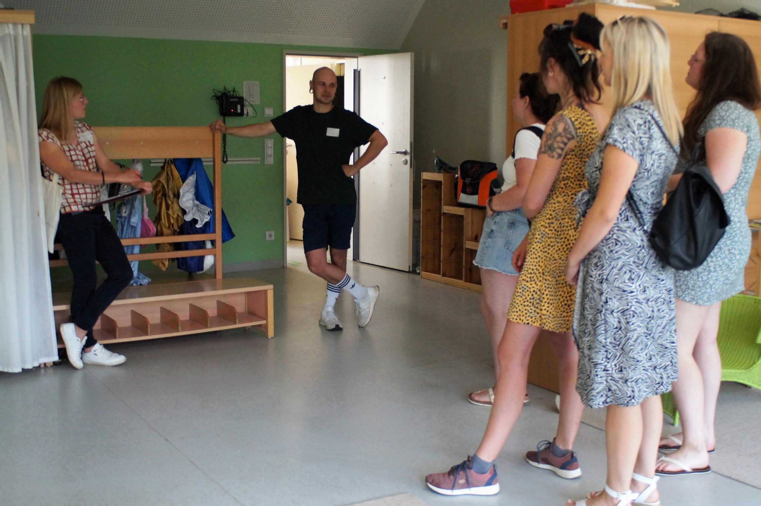 Der dortige Kitasozialarbeiter war ebenso an einem Austausch interessiert und hieß die Kolleg:innen herzlich willkommen. Bei einem Rundgang durchs Haus öffnete er ihnen die Türen zur Kita-Welt. 185 Kinder aus 16 Nationen spielen und wachsen hier in zahlreichen Gruppen- und Themenräumen, z. B. Rollenspielraum, Matschraum, Lego-Raum, Atelier- und Kreativraum sowie in einem großen grünen Außengelände. Den Besucher:innen fielen einige Details besonders auf: bunte Gummistiefeltürme, mehrsprachige Pinnwände mit Terminen und Informationen für eine Willkommenskultur, Schlaf-Körbchen für die Krippenkinder, Schallschutzdecken, eine Holzwerkstatt, eine Zuckertütengirlande aus Eierverpackungen und ein ausgebauter Schrank mit Lampe und Vorhang (laut Kitasozialarbeiter bei den Kindern als Höhle sehr beliebt).