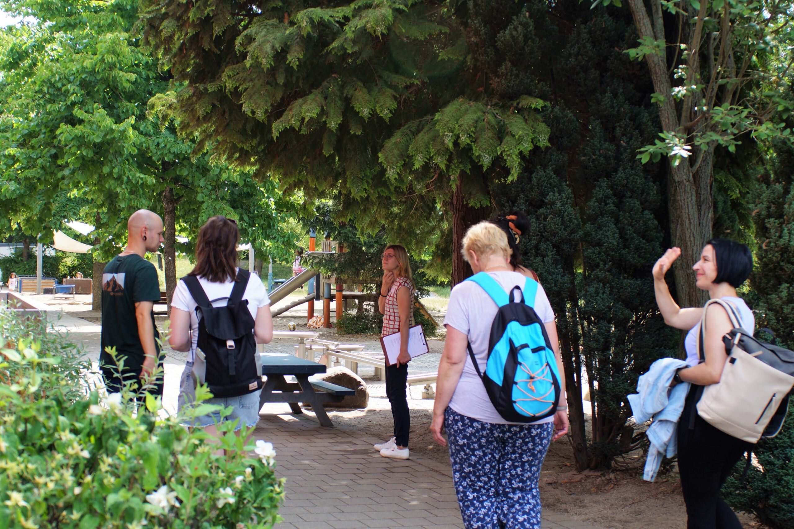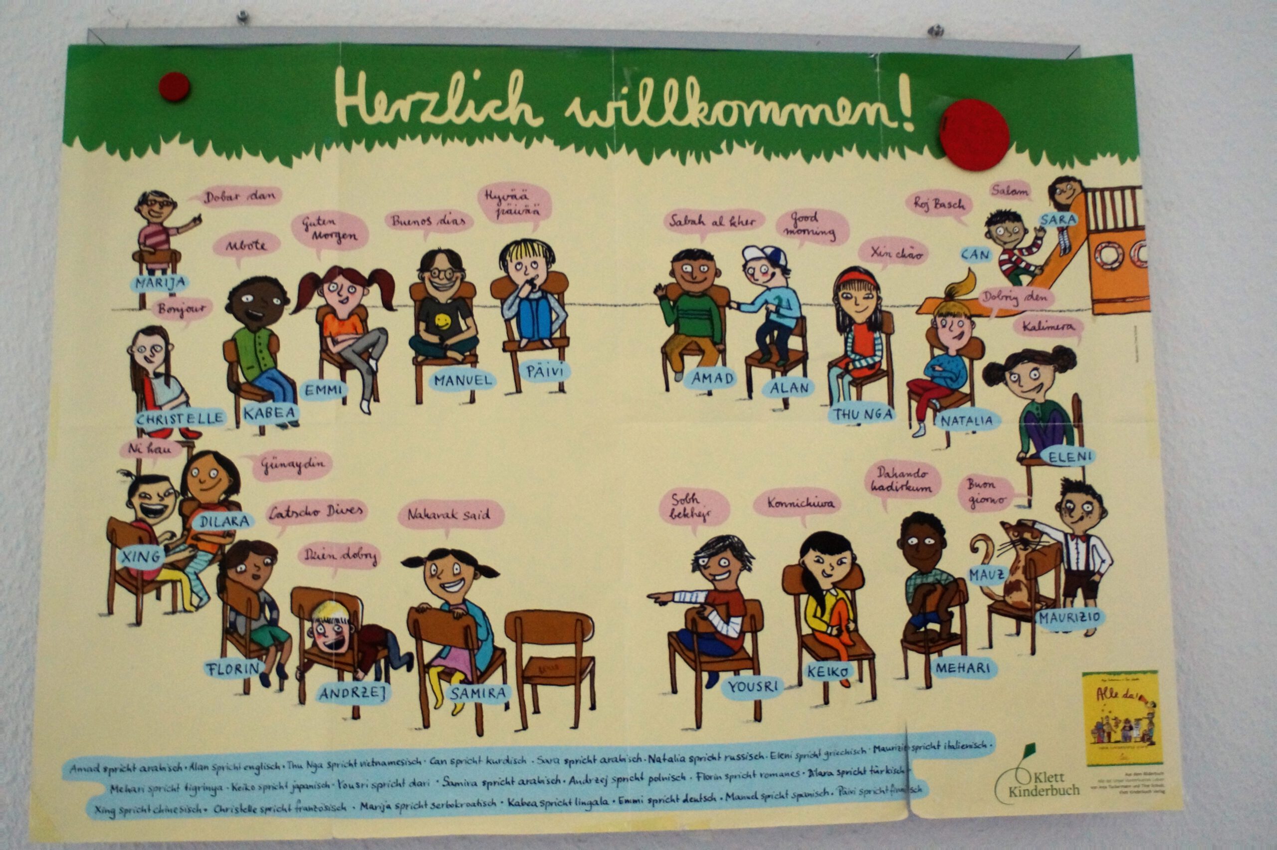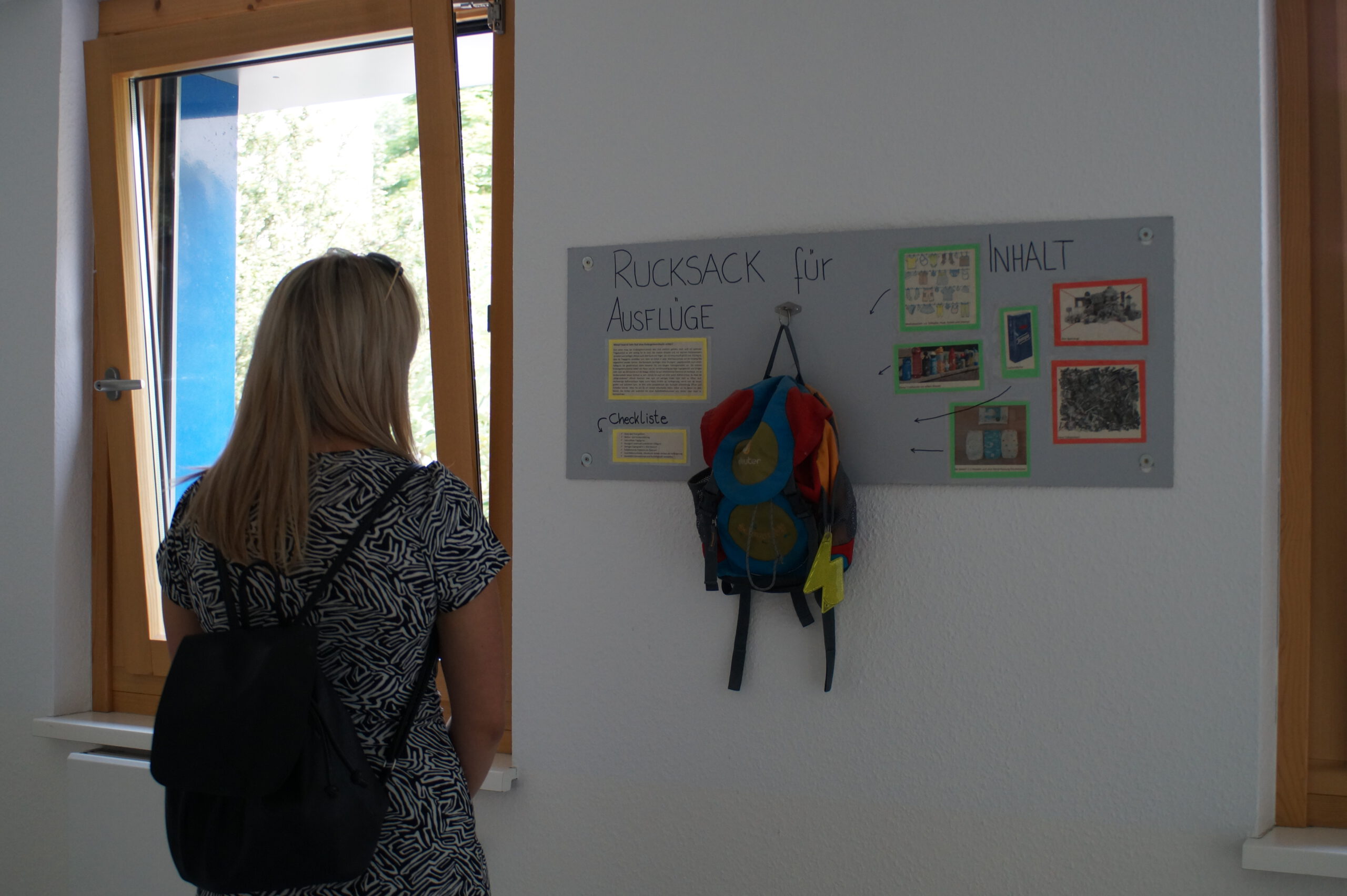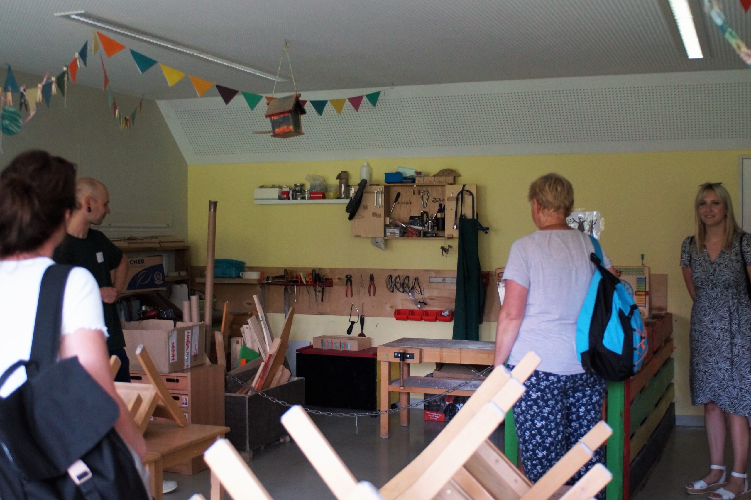 Der dortige Kitasozialarbeiter war ebenso an einem Austausch interessiert und hieß die Kolleg:innen herzlich willkommen. Bei einem Rundgang durchs Haus öffnete er ihnen die Türen zur Kita-Welt. 185 Kinder aus 16 Nationen spielen und wachsen hier in zahlreichen Gruppen- und Themenräumen, z. B. Rollenspielraum, Matschraum, Lego-Raum, Atelier- und Kreativraum sowie in einem großen grünen Außengelände. Den Besucher:innen fielen einige Details besonders auf: bunte Gummistiefeltürme, mehrsprachige Pinnwände mit Terminen und Informationen für eine Willkommenskultur, Schlaf-Körbchen für die Krippenkinder, Schallschutzdecken, eine Holzwerkstatt, eine Zuckertütengirlande aus Eierverpackungen und ein ausgebauter Schrank mit Lampe und Vorhang (laut Kitasozialarbeiter bei den Kindern als Höhle sehr beliebt).