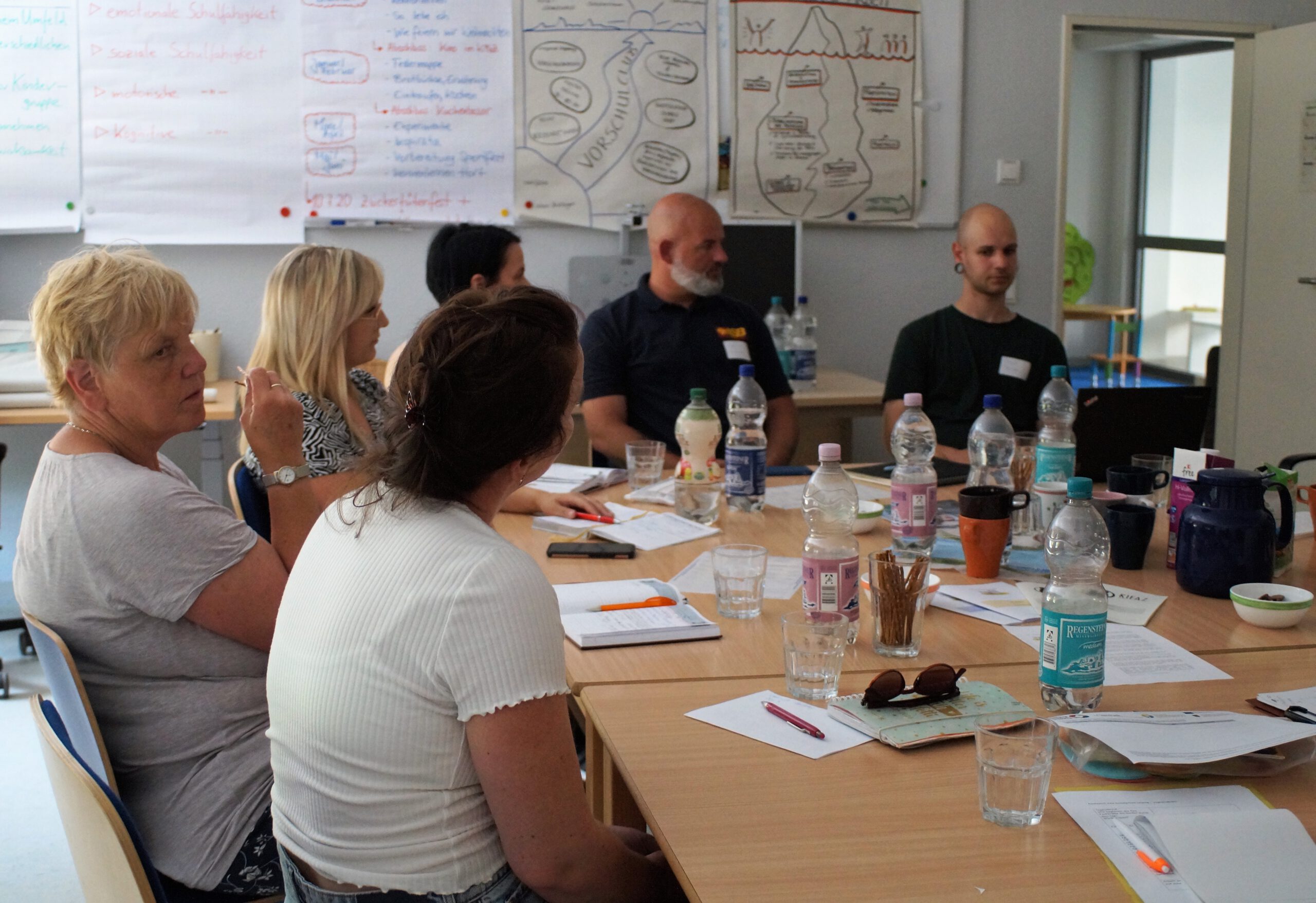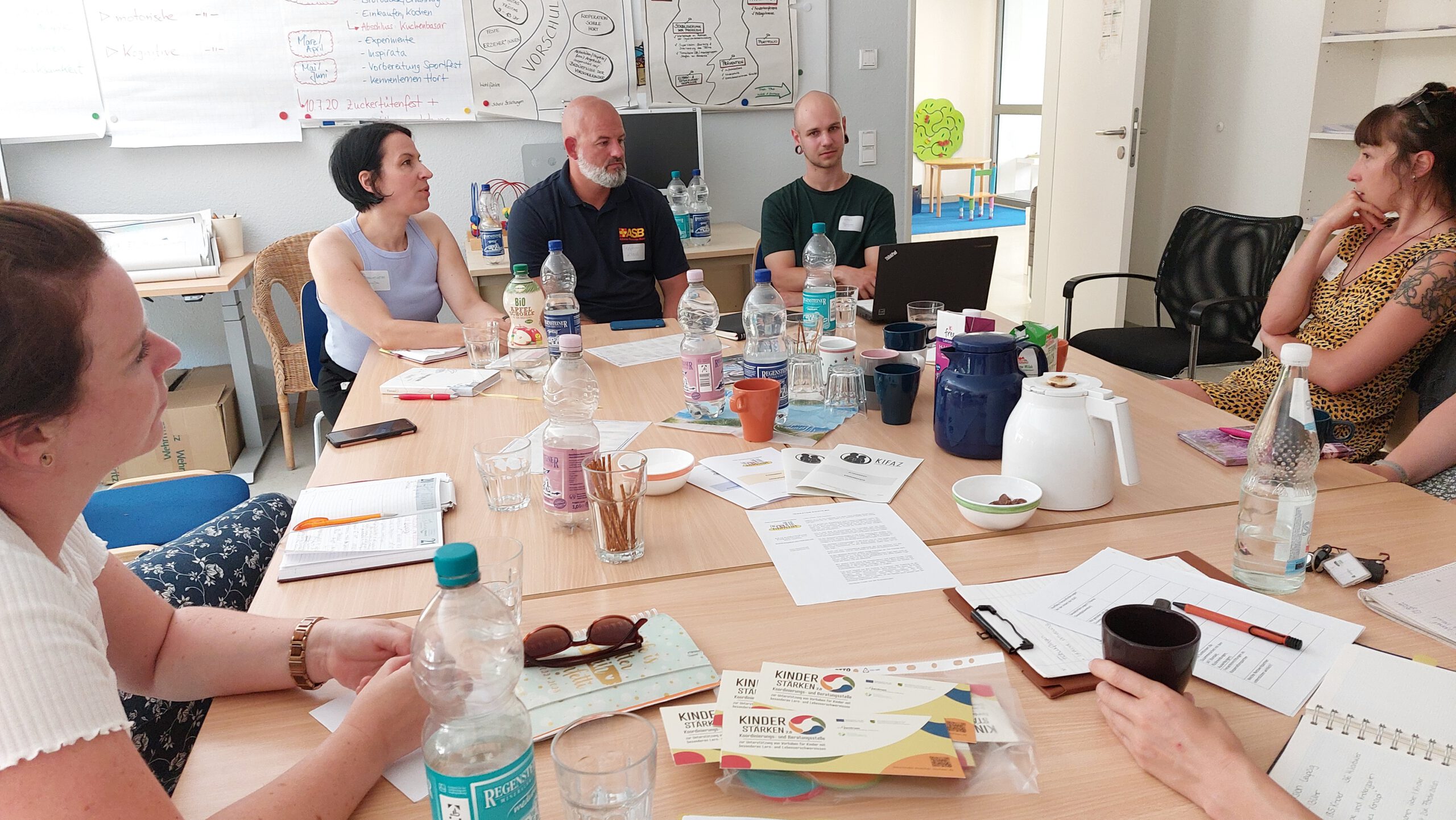 Die Kitasozialarbeiter:innen kamen an diesem Vormittag noch zu weiteren Themen ins Gespräch, z. B. Umgang mit Verdacht auf Kindeswohlgefährdung und häuslicher Gewalt, Suchtproblematiken, Handhabung mit Essensperrungen, Zusammenarbeit mit Netzwerkpartnern und Jugendamt. Sie berichteten vom Spagat zwischen „Feuerlöschen“ und präventiver Arbeit. Der große Erfahrungsschatz ist spürbar. Einige von ihnen waren bereits in der vorangegangenen Förderphase KINDER STÄRKEN dabei.