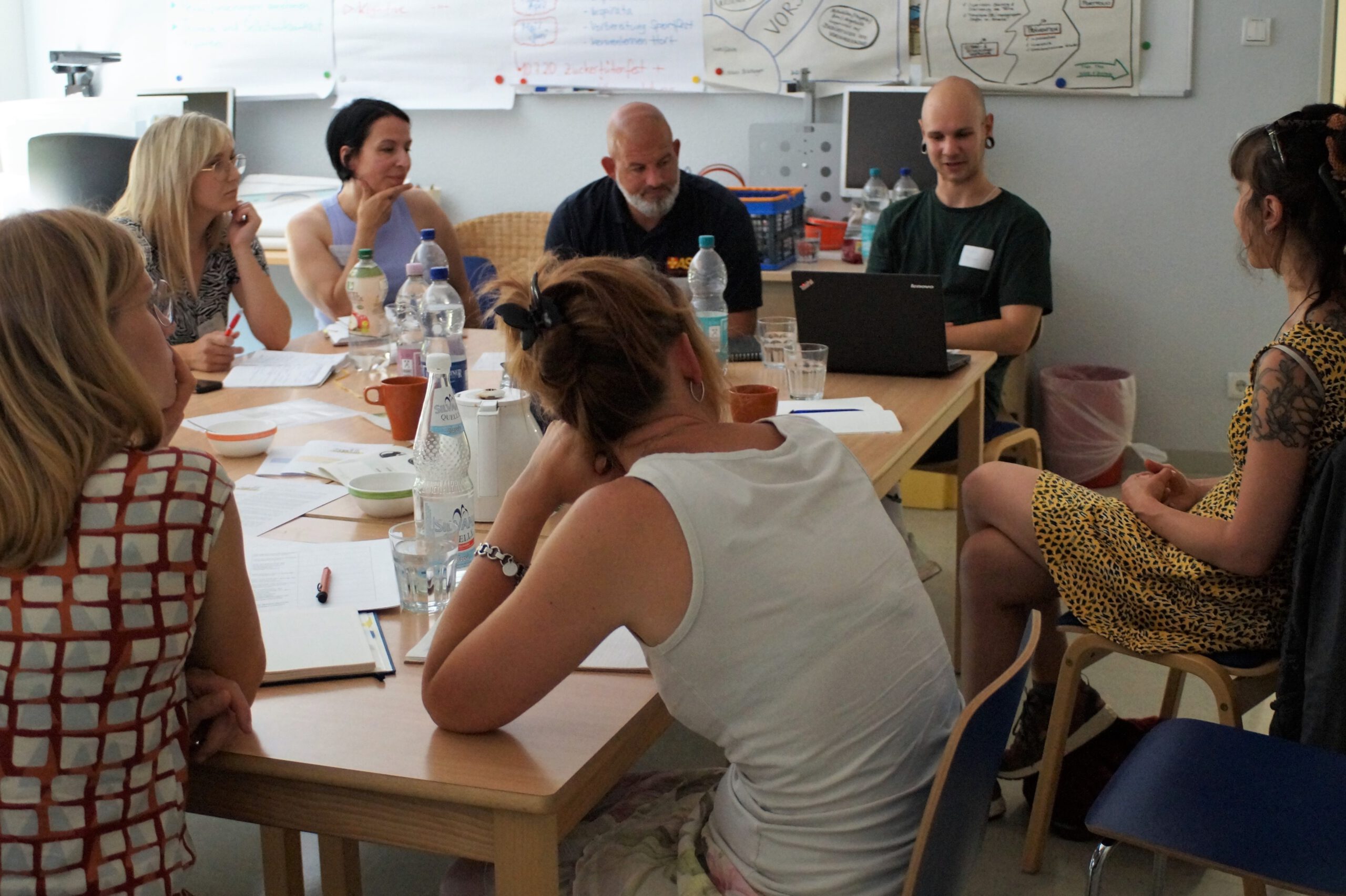 Für die Kitasozialarbeiter:innen aus dem LK Zwickau und Vogtlandkreis ist es ebenfalls ein großes Thema, genau die Eltern zu erreichen, die sie erreichen möchten. Die Gruppe tauscht sich zu Erfahrungen aus, wie sie Eltern besonders gut erreicht haben, z. B. Eltern-Kind-Nachmittage anbieten, da diese besser angenommen werden als reine Elterninformationsangebote; Feste mit internationalem Büffet als Magnet für hohe Beteiligung; den Hintergrund von Festen z. B. Fasching mehrsprachig erklären sowie Eltern ganz gezielt ansprechen. Auch in den ländlichen Einrichtungen gilt es, mit Mehrsprachigkeit umzugehen. Hier wird von guten Erfahrungen mit Geräten zur Sprachübersetzung berichtet.