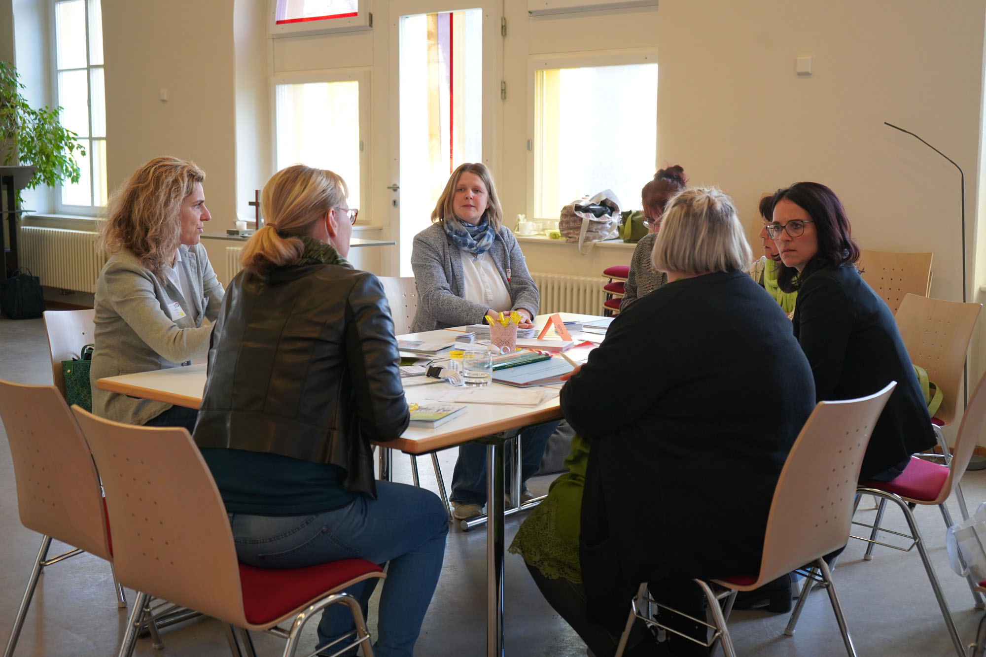 Im Anschluss folgte der Fachaustausch im Open Space, bei dem die Teilnehmenden an verschiedenen Thementischen mit Expert:innen und Vertretungen aus Beratungs- und Unterstützungsstellen aus dem Landkreis ins Gespräch kamen. Hier wurden konkrete Fragestellungen diskutiert und bestehende Unterstützungsangebote vorgestellt. Die Netzwerk-Partner:innen an den Thementischen waren: