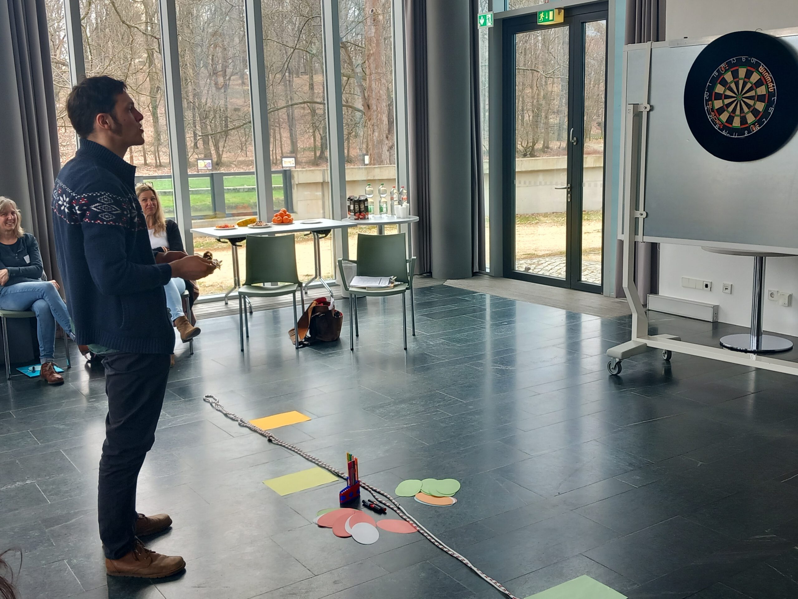 Aus unterschiedlichen Perspektiven näherten sich die TN gemeinsam mit den KBS-Koordinator:innen Marie Müller-Wierick, Axel Möller und Roland Babits der Zielentwicklung und Maßnahmeplanung. Ob aktiv mit einem Wurf eines Dartpfeiles auf eine Zielscheibe oder über die Interpretation von verschiedenen handlungsorientierenden Zitaten. Bevor es einen Input zu Aspekten von Zielen, ihrer Einordnung in das Programm KINDER STÄRKEN 2.0 und das Formulieren von Zielen mit der S.M.A.R.T. -Methode gab, waren die TN auf einem Themenspaziergang unterwegs, um aus ihrer alltäglichen Praxis Themen zu finden, mit denen in der Werkstatt weitergearbeitet werden konnte.